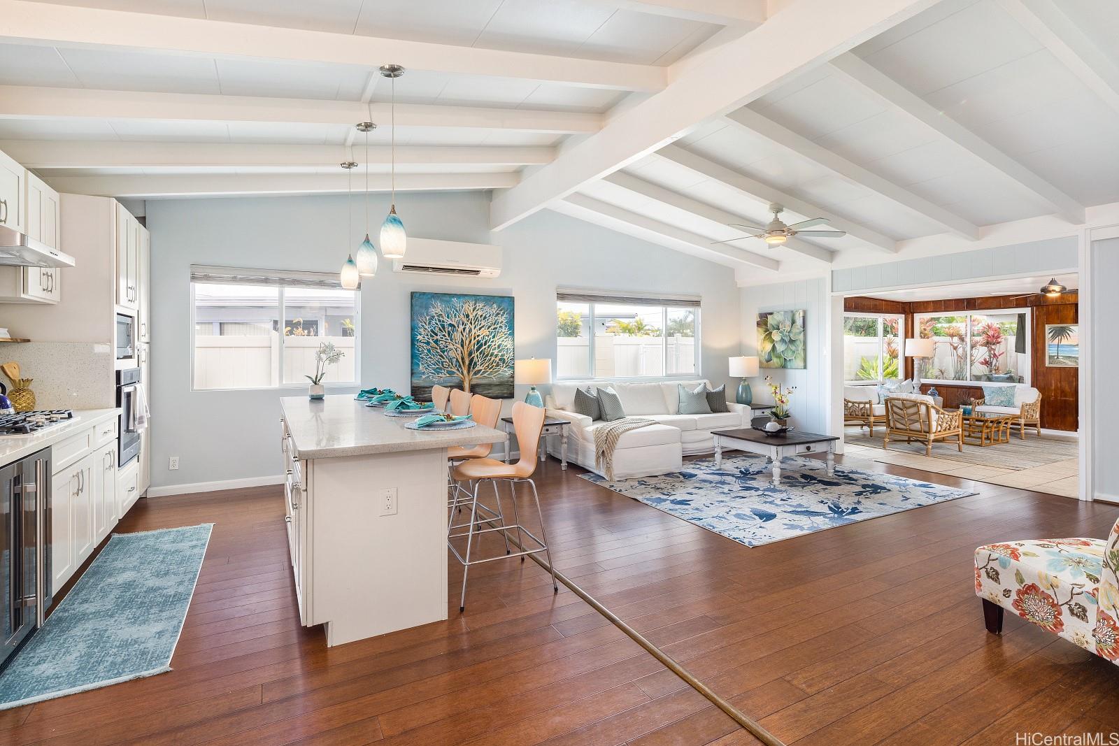 YOUR DREAM HOME AWAITS! Arrive in style through the automatic gate and step into this beautiful 3 bedroom single-family home in Enchanted Lake! Featuring a large L shaped kitchen with quartz countertops, new appliances, and tons of storage & space. The elegance of bamboo and wood flooring flows well throughout the property. Includes a freshly painted interior, 4 split AC units, vinyl windows throughout, multiple spaces for storage, and 22 OWNED solar panels with net metering. Step outside to the the spacious covered lanai that provides an inviting and versatile space, perfect for hosting and entertaining guests or hosting family parties! The expansive backyard that has been transformed through landscaping features beautiful plants, fruit trees, a large outdoor playground with a breathtaking backdrop of the Koolau Mountains. Conveniently located and in close proximity of various eateries, retail shops, schools, beautiful beaches, and many more! Discover the attraction of this peaceful, family-friendly neighborhood and make this your home!