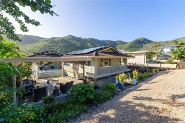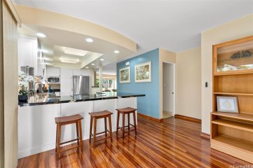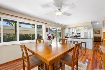Welcome to timeless elegance in the heart of Kalama Valley. This reimagined residence blends island sophistication with masterful craftsmanship, meticulously designed by a master yacht builder whose artistry shines through graceful curves and refined details. Inside, natural textures set the tone—solid bamboo cabinetry accented with sapele mahogany trim showcases superior craftsmanship, while the gourmet kitchen offers a chef’s dream layout with custom soft-close drawers and cabinetry. The adjoining dining area flows effortlessly, naturally cooled by the valley’s gentle trade winds. Outdoors, your private retreat awaits. A lava rock wall encloses the rear of the property, ensuring privacy and framing a newly updated saltwater pool. The rebuilt Trex lanai creates a luxurious setting for lounging or entertaining, seamlessly complemented by a fully enclosed, air-conditioned bonus room—ideal for an office, studio, or wellness space. Perfectly situated near pristine beaches, scenic hikes, and vibrant local dining, this Kalama Valley gem offers an unmatched island lifestyle in one of O‘ahu’s most desirable communities.