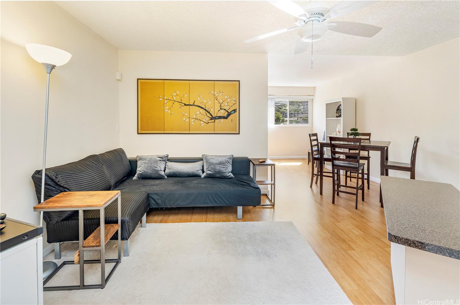 Walk to the Punahou Carnival! This studio feels much bigger than a studio! This is the largest floor plan in 1718 Anapuni, and it's the farthest away from the street in a peaceful neighborhood. This renovated corner/end unit has been lovingly and infrequently used as a 2nd home, so it's still in excellent condition. Renovations: 1) Enclosed lanai enlarged the living space, and modern vinyl windows were added (the crank/rolling storm shutters are still in place), 2) A wall was added to separate the larger space into a bedroom and adds a huge closet, 3) The entry has a built-in work desk with more cabinets. So much storage! A kitchen island on wheels provides prep space and storage. Laminate bamboo flooring is cool on your feet and easy to maintain. Enjoy peaceful mountain views and morning sun; the unit stays cool in the afternoon with shade and cross breezes. 1 assigned partially covered parking stall on the upper level of the parking garage. Plenty of street parking within 1-2 blocks. So convenient to Ala Moana shops and restaurants, H-1 freeway access, and hiking in the city at the Makiki trailhead! Come see this great home!