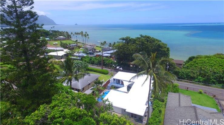 Updated mid-century modern home with plantation touches. Fully remodeled kitchen and bathrooms to include Japanese soaking tub; plus new entertainment center and resurfaced pool. In Lulani Ocean overlooking Kaneohe Bay with views of Mokolii Island, Koolau Mountains plus peek-a-boo bay views. Generous lot of 10,710 sq ft to enjoy many outdoor spaces including separate lanais off the lower lounge area, dining area, master bedroom and main level adjacent to the pool. The guest bedroom with its own entrance opens onto the spacious backyard that boasts mango and lychee trees. There is an attached two car garage with additional parking both front and back and 300 sq ft of covered storage under the home. Close proximity to Laenani Neighborhood Park to launch your paddle board or kayak!