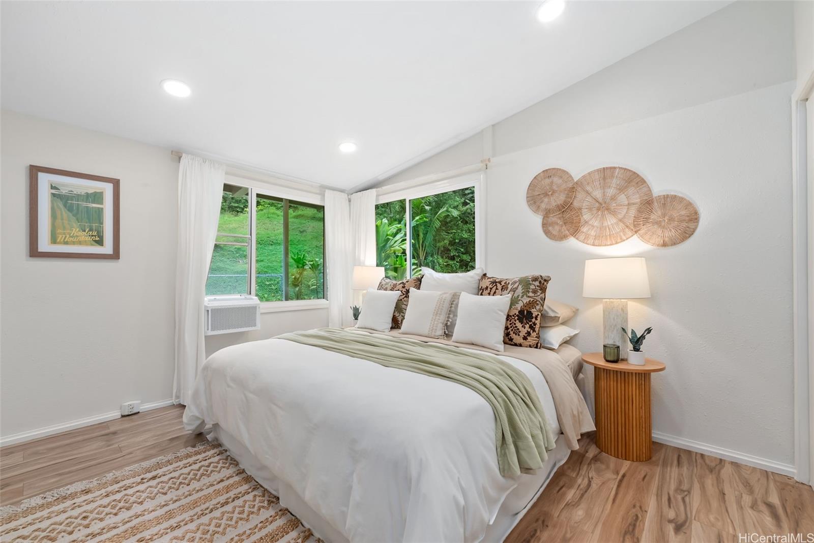 This cozy home is situated at the entrance of over 8 acres of lush greenery, offering a truly tranquil escape from city life. While reaching the upper portion of the property is a hike, it rewards you with absolutely spectacular views. The level area of the lot features a spacious enclosed yard and a separate, thriving vegetable and herb garden. Inside, the home boasts a bright, open-concept floor plan with high vaulted ceilings. The numerous picture windows are perfectly positioned to capture the surrounding garden and majestic mountain views. The kitchen and laundry room feature newer appliances. Additionally, modern bathrooms and air conditioning makes for a comfortable and contemporary living experience. The large deck, approximately 360 square feet, provides ample space for outdoor entertaining and enjoying the clear night skies for stargazing. The convenience of this location—offering true island living with streams, hiking and beaches nearby while remaining accessible to Oahu’s major resources, including the main trauma center, Financial District, Military installations, and abundant dining and shopping—makes this a truly unique opportunity.