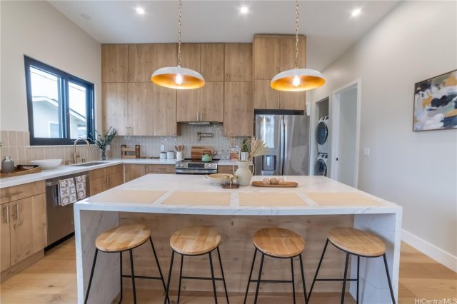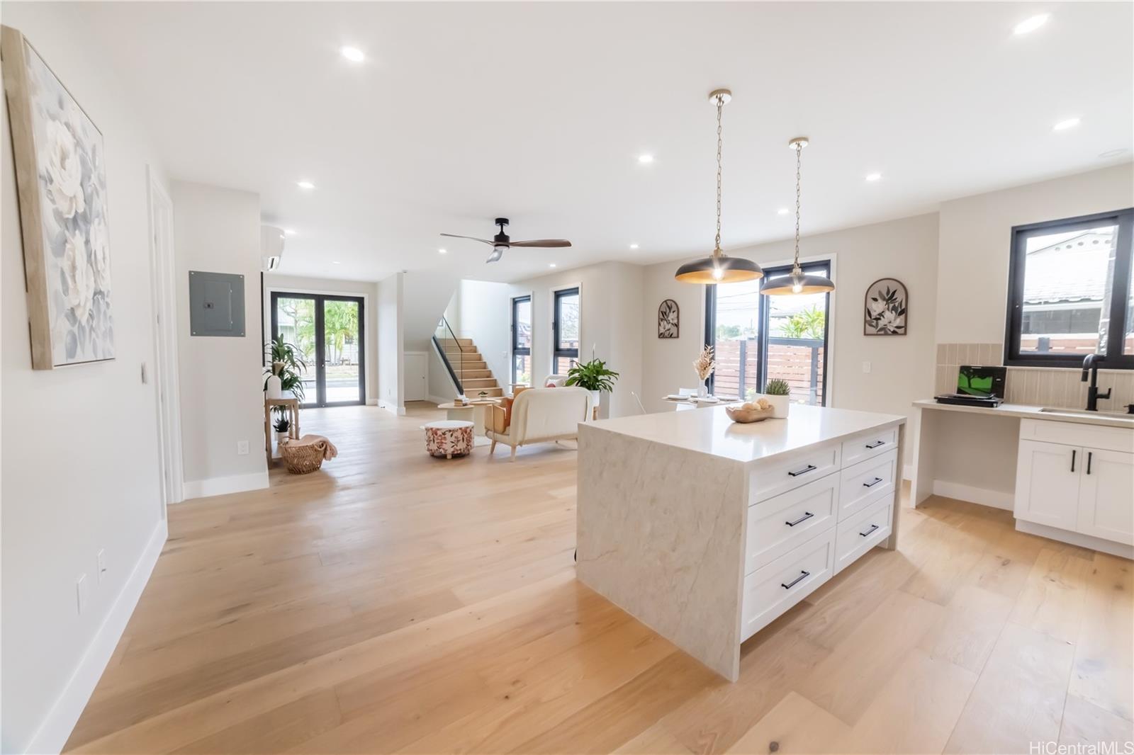 Experience modern island living in this BRAND NEW single-family home, thoughtfully designed with open spaces and high-end finishes throughout. Located in desirable Kailua, this newly built residence blends contemporary architecture with the relaxed comfort of Hawai'i living. The home features a bright, open-concept floor plan (allowing for multi generational living) with soaring ceilings, recessed lighting, and wide-plank flooring.The designer kitchen is a showstopper, offering custom wood cabinetry, quartz countertops, stainless steel appliances, and a spacious island perfect for entertaining. Seamless indoor-outdoor flow creates an inviting space for everyday living and gatherings. Bathrooms are beautifully appointed with modern fixtures, large-format tile, and spa-inspired details, including a luxurious walk-in shower and freestanding soaking tub. Thoughtful finishes and neutral tones throughout create a calm, sophisticated aesthetic.