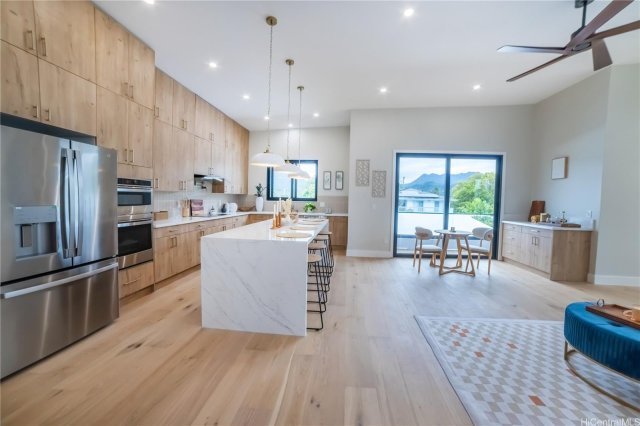 Experience modern island living in this newly constructed contemporary home in the heart of Kailua. Thoughtfully designed with soaring ceilings and an open floor plan for multi generational living. This residence blends upscale finishes with relaxed coastal style. The spacious great room and designer kitchen form the centerpiece of the home, featuring custom cabinetry, a waterfall island, and warm wood textures that elevate the space. Expansive windows and sliding doors invite natural light and ocean breezes throughout, creating an airy indoor-outdoor flow ideal for entertaining. Offering multiple living and dining areas, the layout provides flexibility for multi-generational living, guests, or remote work. The private primary suite delivers a luxurious retreat with generous volume, modern fixtures, and serene views. Additional bedrooms are well-sized with ample storage. Brand new construction. Modern design. Prime location. A rare opportunity to own a thoughtfully built home!