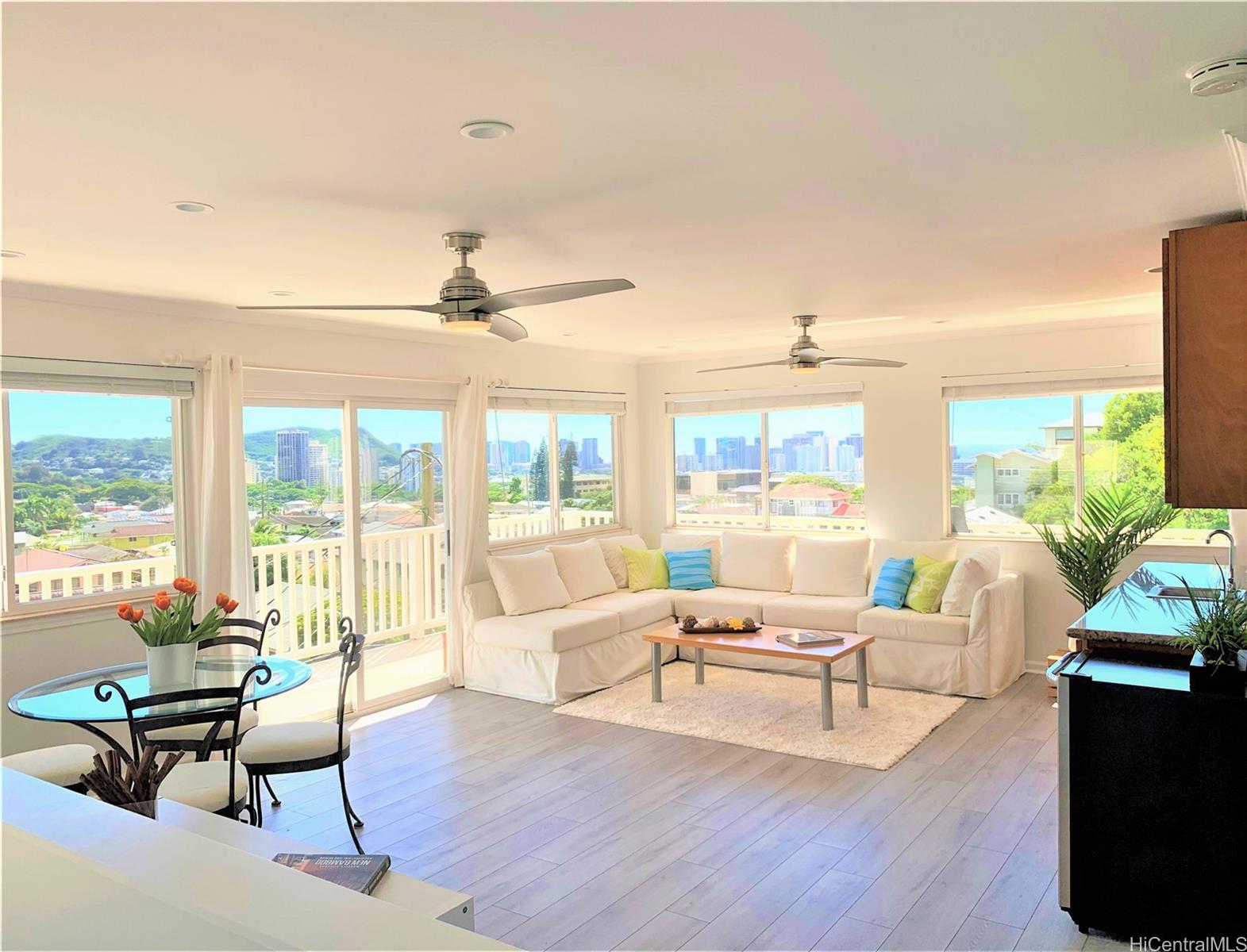 Gorgeous remodeled multi-level house w/2 car garage on hillside of Alewa Heights. Panoramic views of Koolau mountains, Punchbowl, ocean & downtown. Built in 2002, the house features 3 bedrooms, 3.5 baths w/lots of natural light & beautiful views from living, kitchen/dining & all bedrooms. Kitchen has upgraded ss appliances & granite countertops. Open living room w/wrap-around lanai incl. wet bar, wine fridge, ceiling fans. New gray vinyl flooring. Top floor master suite w/walk-in closet & stunning views off lanai. Modern master bath incl. new soak tub, Toto washlet & custom vanity. All 3 full baths are beautifully remodeled. Solar water heater, 2 attic fans and ceiling fans in all bedrooms. New exterior & interior paint. Easy access to downtown, Pali. CPR 1 of 2. Sold "As Is". Steep drive.