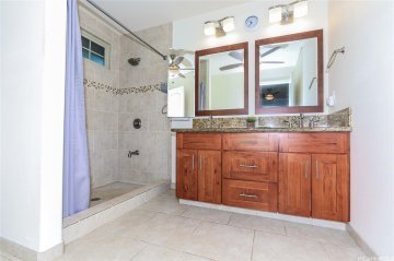 RARE Custom 3 bed 2.5 bath home loaded w/ upgrades in the gated Makaha Oceanview Estates. No side neighbor w/ exquisite ocean & mountain views. Enter through double doors to a travertine foyer & new tigerwood flooring throughout the main living areas. Open concept living & dining flow into a gourmet kitchen w/ granite countertops & stainless steel appliances. Main level features a spacious primary suite w/ ensuite bath & extra large walk in closet. Marble flooring in all bathrooms. The half bath features a custom mango wood vanity w/ onyx sink. Upstairs retreat to a bonus living room w/ lanai & ocean views, plus built in bar/vanity. Custom oversized second primary suite w/ expansive walk in closet & ensuite bath. Third bedroom upstairs w/ mountain views. Landscaped backyard features large covered lanai, new hot tub, bar, water fountain, outdoor shower, fruit trees ( apple banana,orange, avocado), lighting & sprinkler system. Additional features: owned solar panels, new central AC, attic solar fan, plantation shutters, & deep two-car garage w/ laundry. This is a rare opportunity to own a custom, upgraded residence in one of Makaha’s most desirable gated communities.