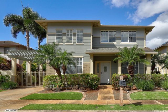 Considered one of the most desirable layouts in all of Woodbridge, this beautiful Banyan Series home features 20 foot Cathedral ceilings, an open layout, and an upstairs loft that was converted to an additional bedroom (Murphy bed included!) and rec room/ office. The landscaped and fully enclosed yard with covered lanai is great for pets, relaxing in privacy, or to entertain family and friends. The large garage and extra-long driveway with a new mechanical gate can provide parking for at least 5 vehicles or a great entertainment area that is open to the kitchen and family room. It's newly painted interior and newer dual zoned central air conditioning is ready for your touches. with a beautiful water feature and tropical foilage . This highly desirable development has lowest HOA fee of all managed communities in the Ewa Beach. Conveniently located close to Ewa Gentry Community Center, parks (dog park too!), schools, walking/ jogging paths, shops, restaurants, entertainment, & bus lines. Lots of nearby activities such as golf courses and beautiful beaches. **Please see Matterport tour**