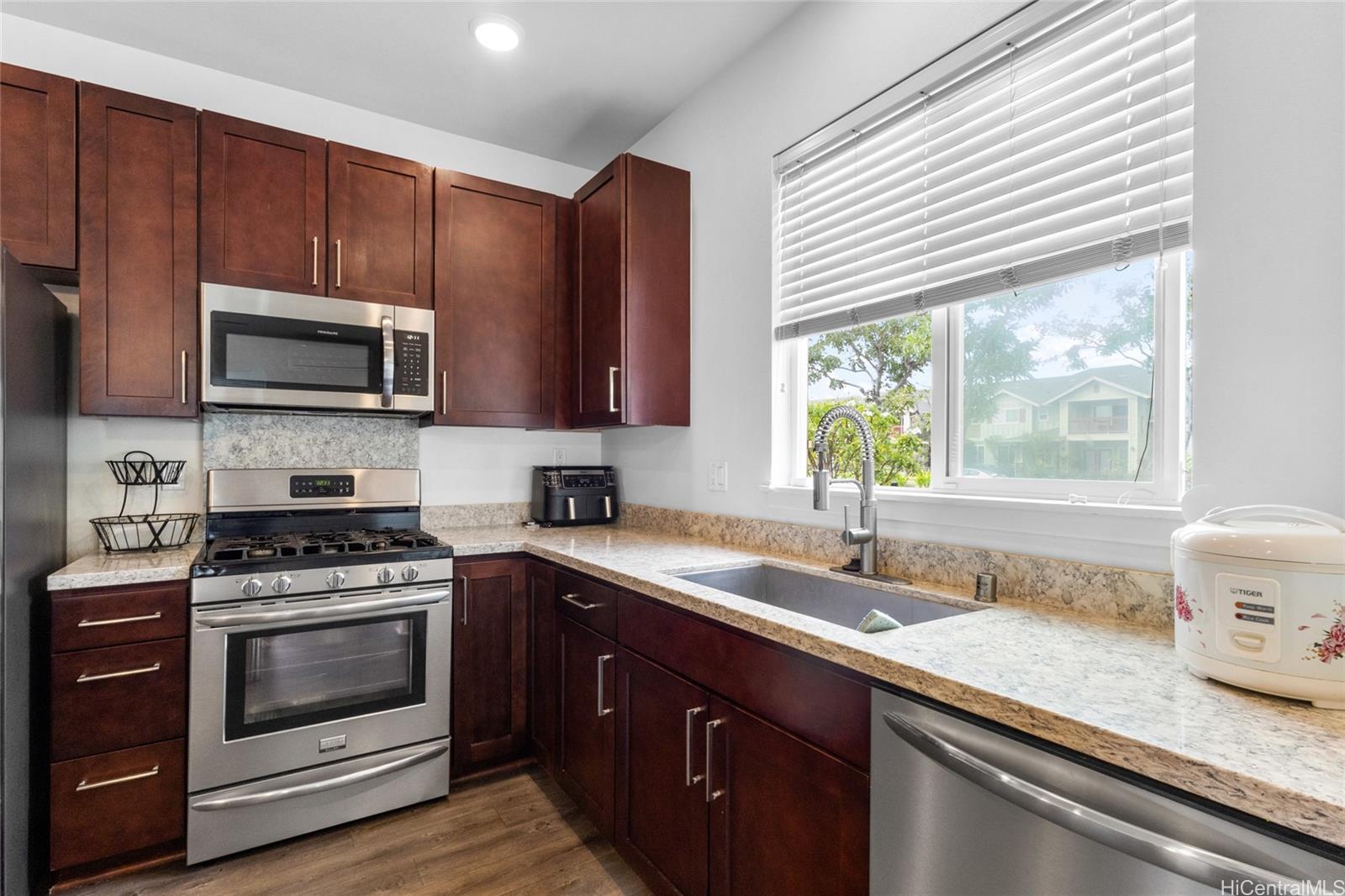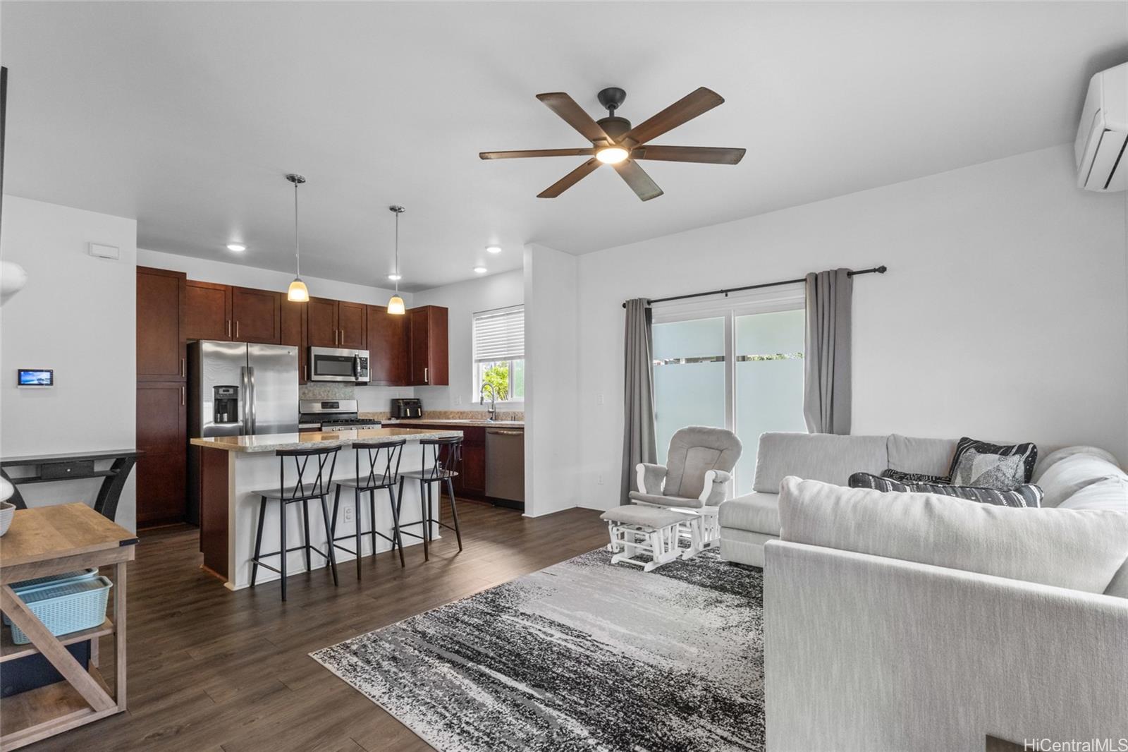Welcome to this beautiful 3-bedroom, 2.5-bath attached home in Ho‘opili, offering a functional and comfortable layout in East Kapolei. Enjoy easy access to nearby parks, playgrounds, and open green spaces that make the Ho‘opili lifestyle so appealing, along with convenient proximity to Kamakana Ali‘i for shopping, dining, and entertainment.Inside, the home features quartz countertops and luxury vinyl plank flooring on the main level, creating a clean and modern feel. A gas range and tankless water heater add to everyday comfort, while split A/C units in every room provide flexible cooling throughout the home.The backyard offers a great space for relaxing, gardening, or entertaining, complete with an automatic sprinkler system for easy upkeep. Parking is a breeze with a full two-car garage, extended driveway, and nearby street parking. A great opportunity to own in one of O‘ahu’s most sought-after communities.