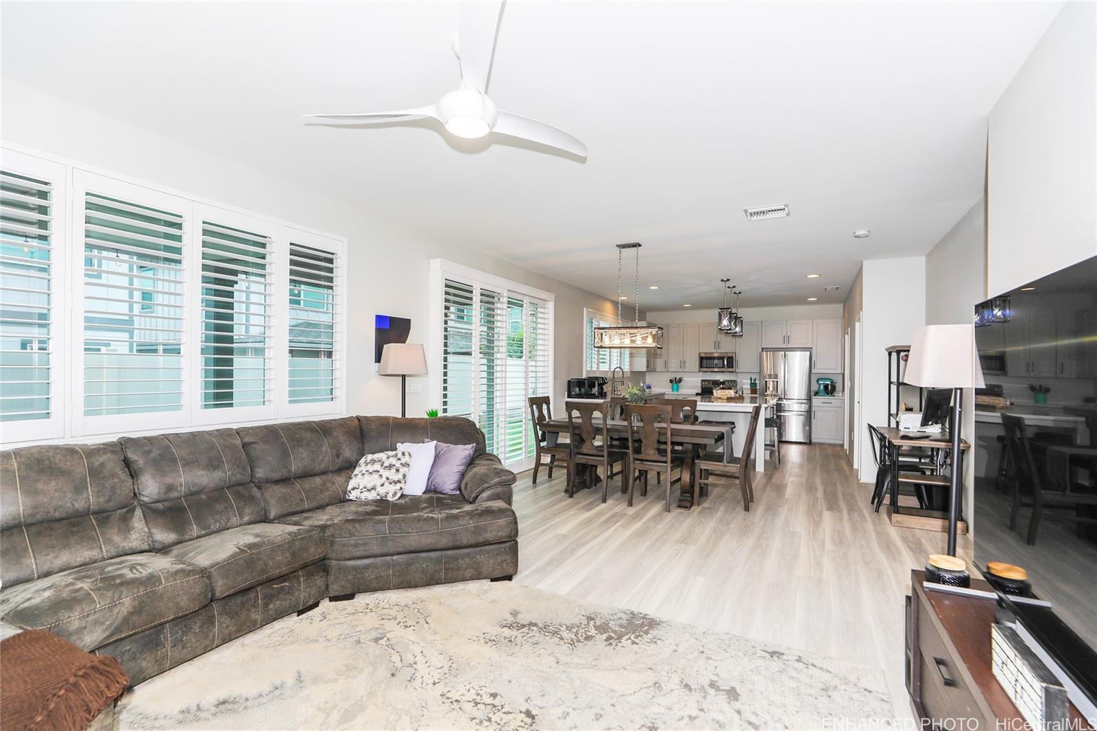 Welcome to Makamae at Ewa by Gentry, a modern community built in 2021. This contemporary home sits on an exceptionally large corner lot, offering one of the most spacious yards in the neighborhood—a rare opportunity with room to add a pool, build an additional dwelling, or create an expansive outdoor living space. Inside, enjoy an open-concept layout with a modern kitchen and bathrooms, complemented by plantation blinds throughout. A ground-floor bedroom and full bath offer flexibility for guests. Additional features include 17 owned photovoltaic solar panels, a water softener, and a reverse osmosis system. Conveniently located near schools, parks, shopping, dining, golf courses, and beaches, this home blends modern comfort with outstanding outdoor potential. VA Assumable Loan at 4% with a balance of $1,086,509.