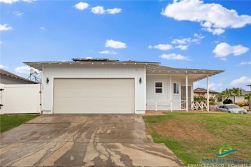 Golf course frontage living in Ewa Villages! Discover this pristine single-level, 3-bedroom, 2-bath home with views of the Ewa Villages Golf Course. This energy-efficient home boasts an owned 25-panel photovoltaic (PV) system on coveted **NET metering**, significantly reducing energy costs. It's also pre-wired for electric vehicle charging and includes a gas tankless water heater and central AC for modern comfort. The upgraded kitchen, complete with a center island is perfect for entertaining or family meals. Throughout the home you'll find stylish luxury vinyl plank flooring, leading to a covered lanai that provides a peaceful outdoor retreat. Parking is plentiful with a spacious 2-car garage and an additional driveway for 2 more vehicles. The beautifully landscaped yard enhances curb appeal, while quality steel frame construction ensures long-term durability. Located just minutes from the H-1 freeway, Kapolei Parkway, and Ka Makana Ali'i Mall. Conveniently located near shopping and dining.