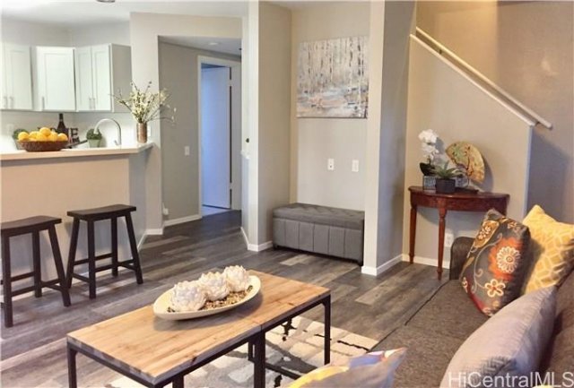 Beautifully renovated in the Las Brisas! Brand new kitchen with gray shaker cabinets, white and silver glitter quartz countertops, brand new stainless steel appliances, and motion sensor faucet. New carpet upstairs and new wood grain water proof vinyl downstairs. New central AC system, new garage door and motor, 25 owned PV panels, tinted windows, solar water system, 6" rain gutters, new interior paint, new light fixtures, surf racks, etc.. NOT ZERO LOT with 2 gate entries on both sides of home and concrete tile in the back, perfect for storage. Good side yard with lots of fruit trees! Can fit a car outside of the garage and includes 1 parking pass for the guest area. Comes with plans to extend. Short distance to pool, playground, Holomua, and dog park. Open house 1-7-18 from 2-4pm.