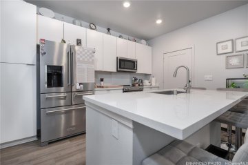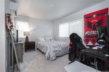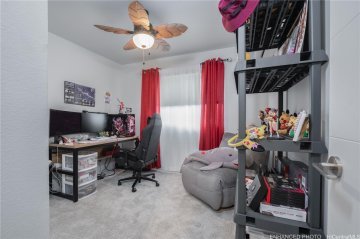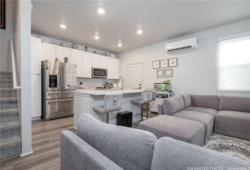 This two story 3-bedroom 2-bathroom detached single family home consists of 919 square feet of net living area and a fully fenced private back yard area. When you step into this home, you will be greeted by the living room that leads seamlessly into the kitchen featuring a bar height seating area, stainless steel appliances and white soft-close cabinets. Also on this floor is a primary bedroom with a closet and ensuite bathroom with a vanity sink and walk-in shower. The second level features a bonus room, perfect for an office, game room, or play area. Also on this floor are two secondary bedrooms and a bathroom with dual vanities and a shower-tub combination. Whole house split air conditioning and modern appliances including a range/oven, micro-hood, dishwasher, refrigerator, and washer/dryer allow for ease of living.