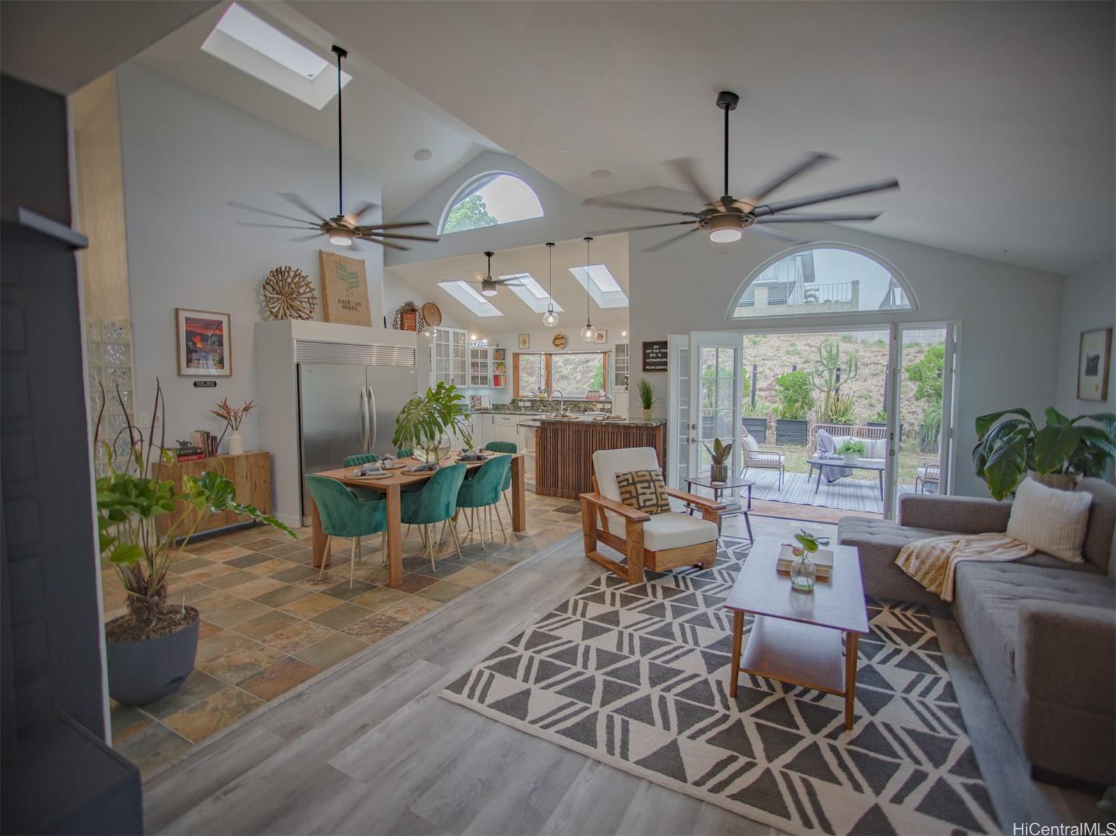 STUNNING Upper Makakilo - Highlands gem! The flagstone walkway and vibrant front door welcomes you into an open foyer with superabundant built-in shelving and bench seating. As you enter this 3-bedroom/2-bath single level home you are surrounded by a spacious 1,434 SqFt Open Floor plan with living room French doors leading out to your first backyard lanai. The soaring vaulted ceiling with numerous windows & skylights allow for a warm embrace of ample natural lighting. Special features include luxury vinyl plank flooring throughout, updated kitchen with bay window, remodeled master bath and more. The 5,800 SqFt lot and backyard up slope are a blank canvas ready to personalize so as to compliment the elegance of the interior. No real need for an air conditioner as the home is cooled year round by the almost constant breezes. A drive of only minutes to several shopping centers, major stores, restaurants, banks, luxury movie theaters, parks, mall, and the lagoons of the Ko Olina resort community. Within a 15 minute drive to surfing at White Plains or drive a little further to several popular spots along the Leeward coast. Come experience the meaning of Real Estate CLARITY…