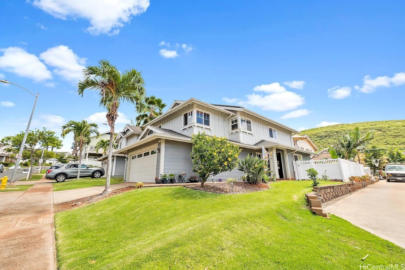 Seller is offering $10,000 credit towards buyers closing costs or to buy down interest rate points. Enjoy the cool Makakilo breeze in this spacious open floor-plan with Southerly ocean views from every room upstairs. The main floor living includes a living room and a dining room that flow into a large covered lanai. There is a convenient first floor bedroom and bathroom with easy access to the shower. Perfect for anyone wanting to avoid steps. The main bedroom has a walk-in closet and a deck with ocean views. Beautifully maintained, the exterior and interior has been painted and new vinyl plank flooring was installed throughout the upstairs. There is a spacious loft upstairs that has ocean views, and it could be used for a fifth bedroom, office, or a gathering place. The garage is right off the kitchen for convenience of loading groceries and houses the washer, dryer and a laundry sink. There are 49 leased solar panels with 3 backup batteries. All this and a very quiet neighborhood with a low HOA! Kapolei's shopping, restaurants and entertainment just minutes away.
