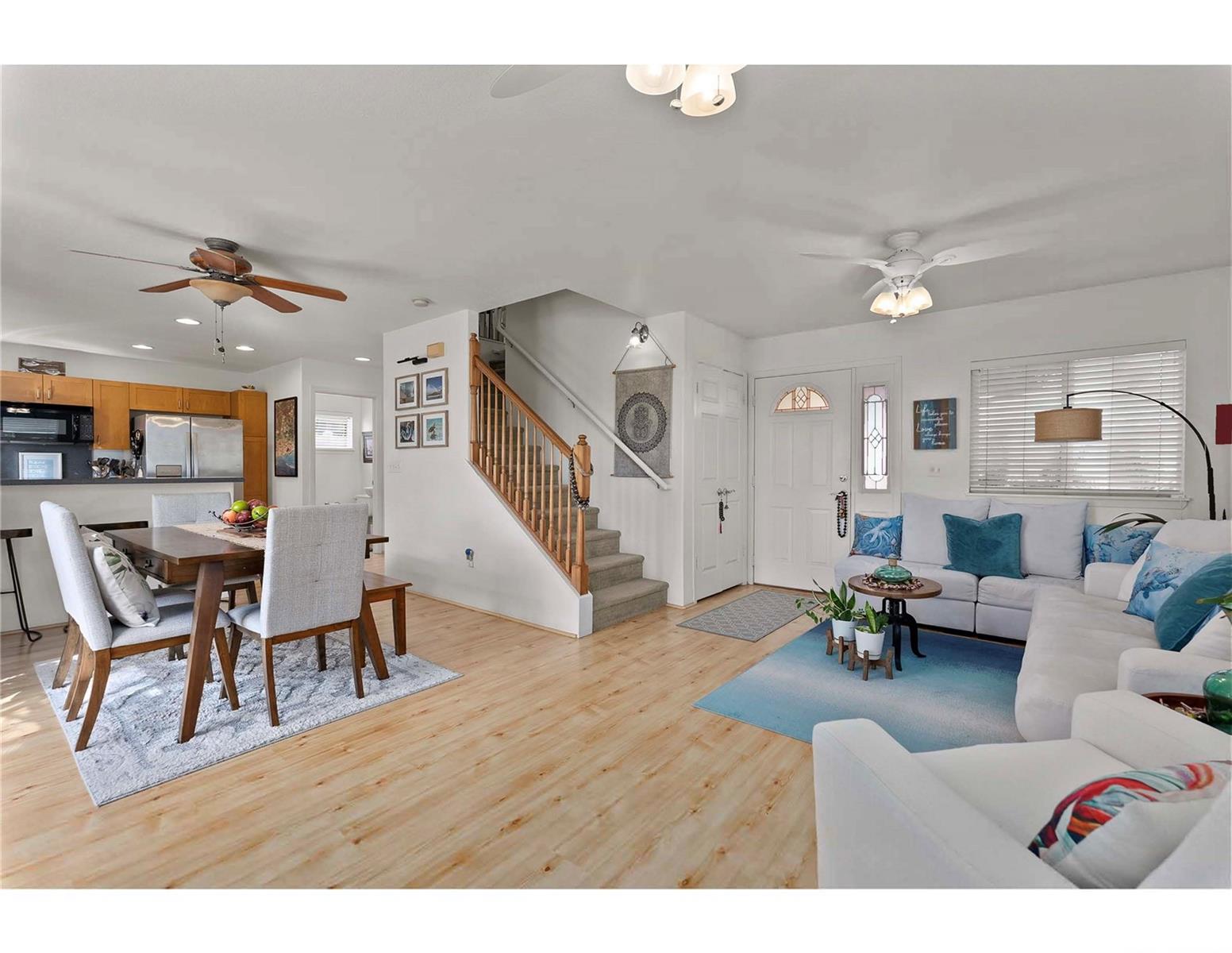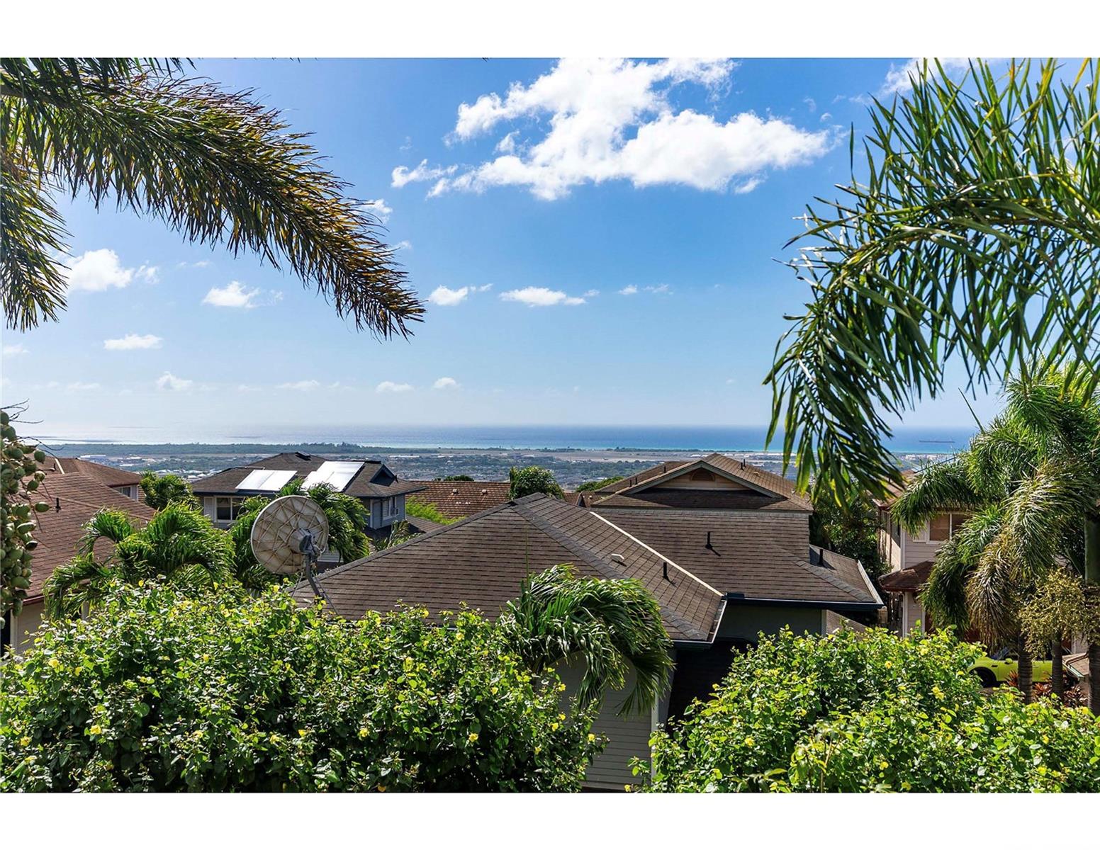Welcome to Watercolors at Makakilo. Upper Makakilo is known for its nice breeze and ocean views from the west side all the way to Diamond Head. Enjoy the view of the ocean and Diamond head while driving down to the freeway and Kapolei area. This beautiful and well kept home features an expanded primary bedroom with views of the ocean and city lights. This home has 3-bedrooms/ 2.5 baths attached 2-car garage. There are wood laminate floors throughout downstairs and carpeted upstairs. Equipped with stainless steel appliances, split Ac and ceiling fans. In the easily maintained back yard area there is a concrete slab patio surrounded by luscious green plants. Easy access to the freeway, shops, groceries, medical facilities and transportation service: Bus service right off the entrance of Watercolors community. Queens and Kaiser medical facility, groceries like Safeway, Foodland, Don Don Donki and Costco are all a short distance away. Short drive to beaches of Barber's Point and Ko'olina Resort and countless restaurant options.