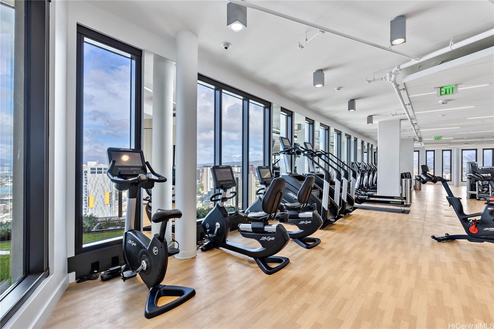 Immaculate gorgeous ocean-view studio with a lanai at A'ali'i in Ward Village, competed in 2021. Features sleek European-style cabinetry, custom Murphy bed, floor to ceiling cabinets and thoughtfully designed storage. The modern kitchen showcases clean European design with glossy integrated cabinetry, stone counters, a full height marble style backsplash, premium stainless steel Bosch appliances and polished fixtures - elegant, efficient and beautifully connected to the living space. Sold fully furnished with A/C, appliances, furnitures, new washer/dryer and cookware included. Enjoy the 8th floor resort dect with pool, spa, keiki pool, BBQ cabanas, lounges and play areas. The 42nd-floor Sky Deck offering a fitness center, yoga studio, lounge spaces, game room and open air terrace overlooking the city and coastline. Includes one assigned parking stall, generous guest and retail parking stalls, pet friendly living, surf/bike storage, dog park/shower room and 24 hour staff. Steps to Whole Foods, Ward Village, Shopping outlets, dining, parks and Ala Moana Beach. This residence blends modern island living with a clean European feel in Honolulu's premier master-planned community.
