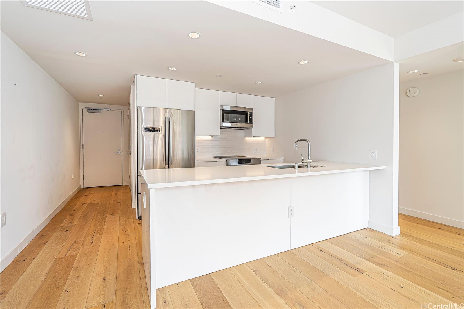 Spacious 1-Bedroom unit FOR SALE at Ward Village’s Ae’o condominium. Ae’o is located in the heart of blooming Kakaako district, building amenities include 25 meter fitness pool, cabanas, state-of-the-art gym, private movie theater, karaoke lounge, top floor dining area with panoramic ocean views and a dog run. Residents also have dedicated access to Whole Foods Market. Unit comes with 1 parking stall, deeded storage, upgraded motorized shades, full bath with adjustable shower bar/handheld shower-head and TOTO Washlet, washer/dryer and central A/C.