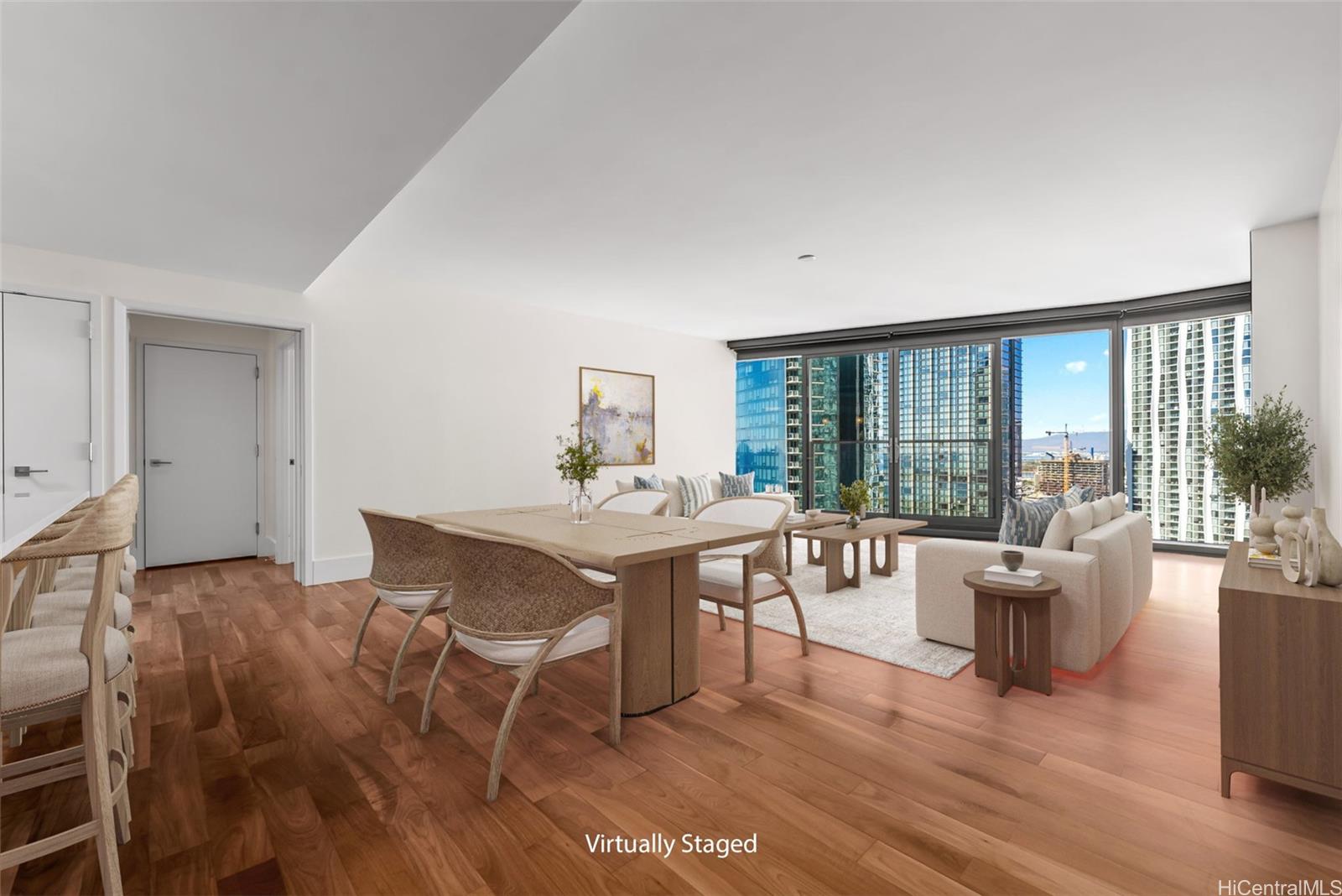 Exceptional 2-bedroom, 2-bath residence in Ward Village, a master-planned community attracting both local and global residents with its blend of urban convenience and modern refinement. This larger 2 bedroom condo offers an open-concept floor plan, ideal for entertaining, and features high ceilings throughout. The chef’s kitchen is equipped with Miele appliances, including a gas range and wine refrigerator, and a breakfast bar with upgraded pendant lighting. Additional features include a separate laundry room with built-in shelves, upgraded wood floors in the bedrooms, motorized shades throughout and an air-conditioned storage room (on the 5th floor). Enjoy stunning views of the ocean by day and twinkling city lights by night from almost every room. Residents have access to world-class amenities, including a glass-bottom pool, whirlpool, tennis court, golf simulator, BBQ cabanas, a chef's kitchen and dining room, gym, theatre, guest suites and other amenities that rival white-glove condos in other global luxury markets. Conveniently located within minutes to Whole Foods, beaches, the marina, Urgent Care and hospitals, shopping and dining.