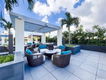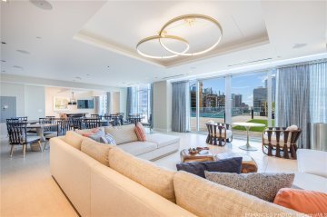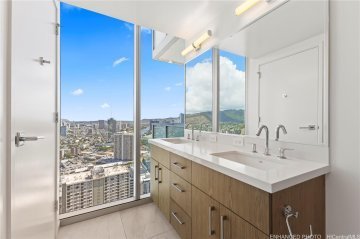 Experience elevated island living in this stunning 2-bed, 2-bath corner unit offering sweeping views of the ocean, city, Magic Island, and harbor. As the largest 2-bedroom floor plan in the building, it features floor-to-ceiling windows and split AC throughout. The modern kitchen is equipped with glossy white cabinets, quartz countertops and premium Sub-Zero, Bosch and Wolf appliances. The side-by-side washer and dryer is located just off the kitchen. The primary suite offers ocean views, a walk-in closet and a deep soaking tub. Additional features include two covered side-by-side parking stalls and built-in pet food trays. Enjoy the inviting and convenient amenities: pool, spa, gym, BBQ cabanas, club lounge, theater, guest suites, dog park, EV charging stations, and 24/7 security—all in an unbeatable location near Ala Moana Beach, shopping, and dining! And for added peace of mind, Azure is fully covered with 100% hurricane insurance.