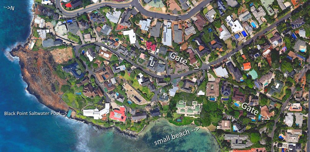 ここブラックポイントではわずか12戸の住宅が海の上に位置しています。カハラ・ブラックポイントオーシャンフロントの意味は、荘厳な岩の海岸線とそこからの荒々しい波を意味します。遊泳可能な海は東側にある隠れた小さなビーチでロイヤルサークルオフゲートの後ろにあります。