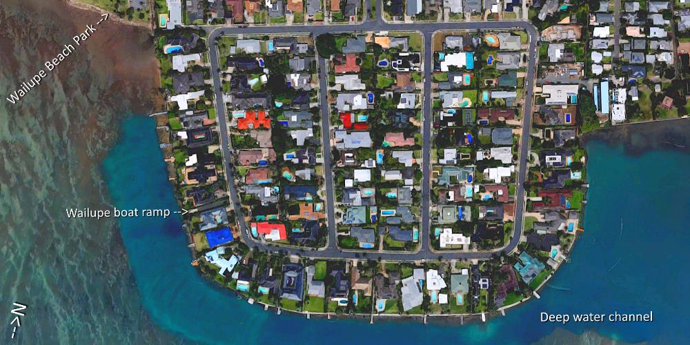 ここは海に突き出た人口の島で3方向からクリスタルブルーの美しい水に囲まれています。ワイルペ半島の住宅は溶岩でできた防波堤によりプライバシーが保護されています。ビーチにいく代わりに、ここでは裏庭に停泊したプライベートボートに乗るだけですぐに海へと出れるのです。