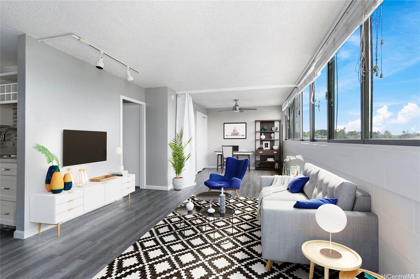 Nice Corner Unit and fully upgraded! New Kitchen with updated cabinets, new appliances and beautiful upgraded quartz counter tops. Freshly painted throughout and upgraded bathroom! 2 bedroom unit with 1 bath in Centre Court. New Beautiful flooring throughout the home! Find an enclosed lanai for extra storage. Has a beautiful view of Pearl Harbor from the living area, and an option to extend your living space or use it for the second bedroom. Parking stall is near the door to elevator to make it convenient to the elevator to the unit. This building is pet friendly has amenities like a pool, BBQ area and tennis court!