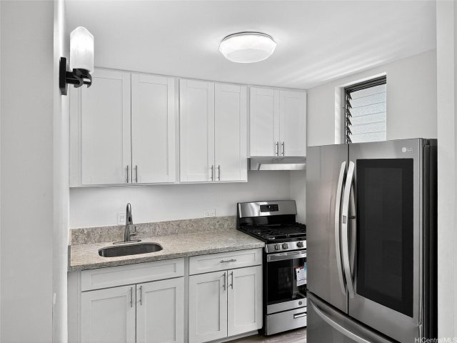 BIG PRICE REDUCTION Motivated seller listed below tax assessed value & fully renovated MOVE IN READY unit! Don't miss out on this convenient and comfortable newly renovated 2-bedroom, 1-bathroom corner unit offers the perfect balance of functionality and comfort. Installed with all modern LED lighting, new fans and AC in every room for your comfort. All newly installed vinyl flooring throughout, Cinder block wall patched up & Popcorn ceiling removed! Updated Kitchen with HUGE 29 Cu. ft refrigerator and new wall niche tub style finish shower. All custom built closets throughout for extra storage room and all your storing needs. With an Extra long parking stall that can fit one 8ft bed truck or may fit up to two small compact vehicle. Features community laundry area. Nearby to Freeway, Ward, restaurant, shops for your convenient & easy travel!