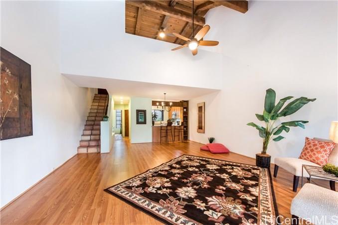 A verdant and tropical oasis describes the surroundings of Eden at Haiku Woods. Your private stairway leads you to this 2 bedroom, 2 1/2 bath townhome with soaring ceilings, laminate and saltillo flooring, an extra spacious lanai and a remodeled kitchen with granite countertops and newer appliances. Conveniently located to Haleiwa Joes, Windward Mall, restaurant and much more.