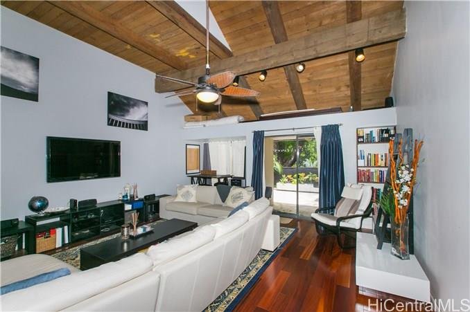 Spacious, fully renovated in lush Kaneohe. Vaulted ceilings with exposed beams, open floor plan, 2 master suites, 2.5 bath, private lanai. Kitchen redone with quality stainless steel appliances, granite counters, cherry cabinets, built-in wine cooler. New paint and Tigerwood hardwood flooring throughout. All bathrooms have travertine flooring. Master bath features a floor to vaulted ceiling tiled shower with glass accents, cherry cabinet and glass tile backsplash. The guest bath has a tiled bathtub enclosure with glass accents, a pedestal sink and all new trim. The downstairs half bathroom has cherry cabinet, artisan sink and full-sized stacked front load washer and dryer. The master bedroom has an open wall overlooking the downstairs living spaces. Energy star portable a/c units included.