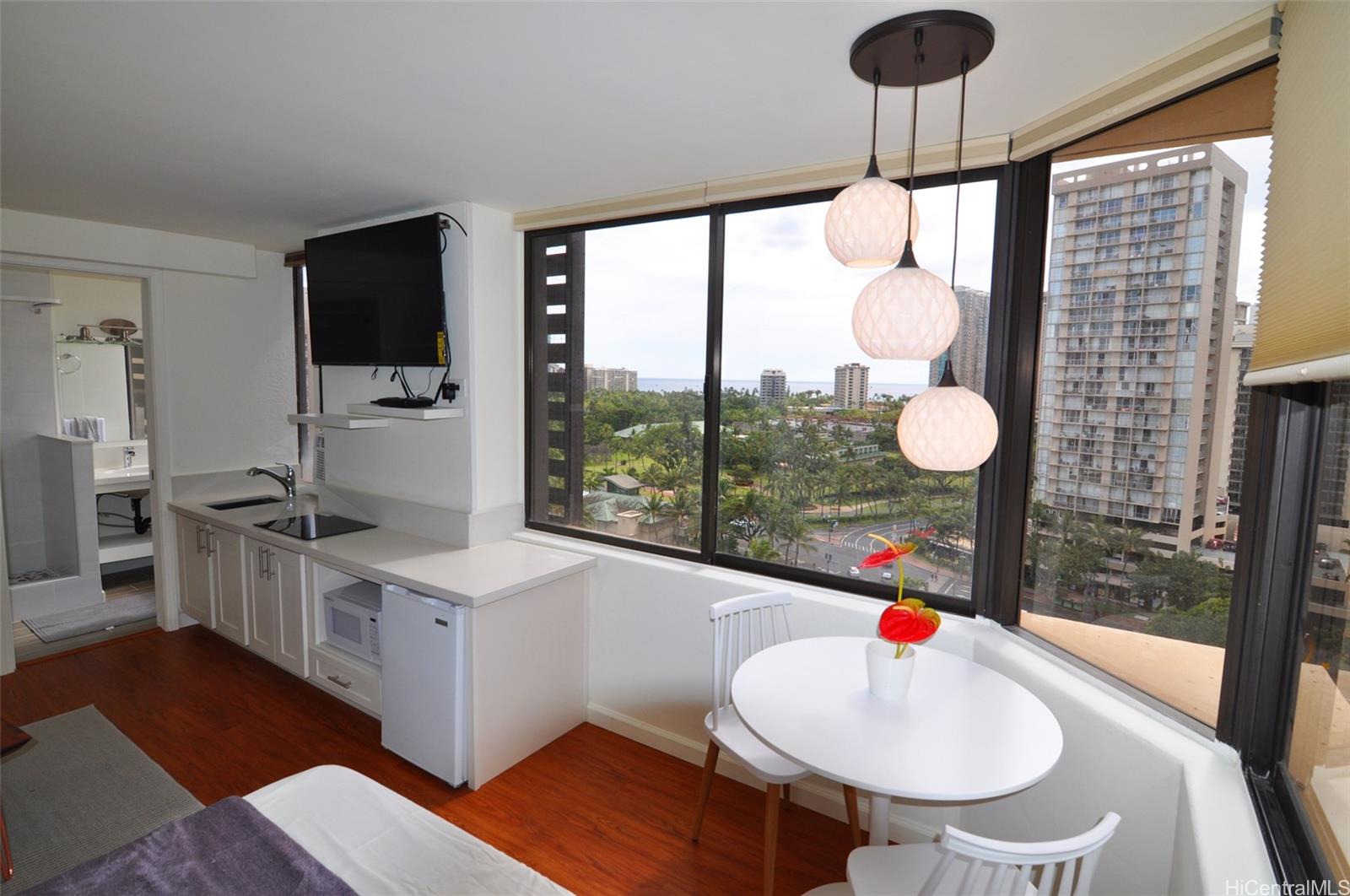 Excellent condition. Brand new renovations (with the addition of a new kitchenette), just completed! Bright and sunny with breeze and ventilation. Beautiful Waikiki and ocean views. Fully furnished. Low maintenance (plus monthly charge of $21.04 for TV/ Internet)