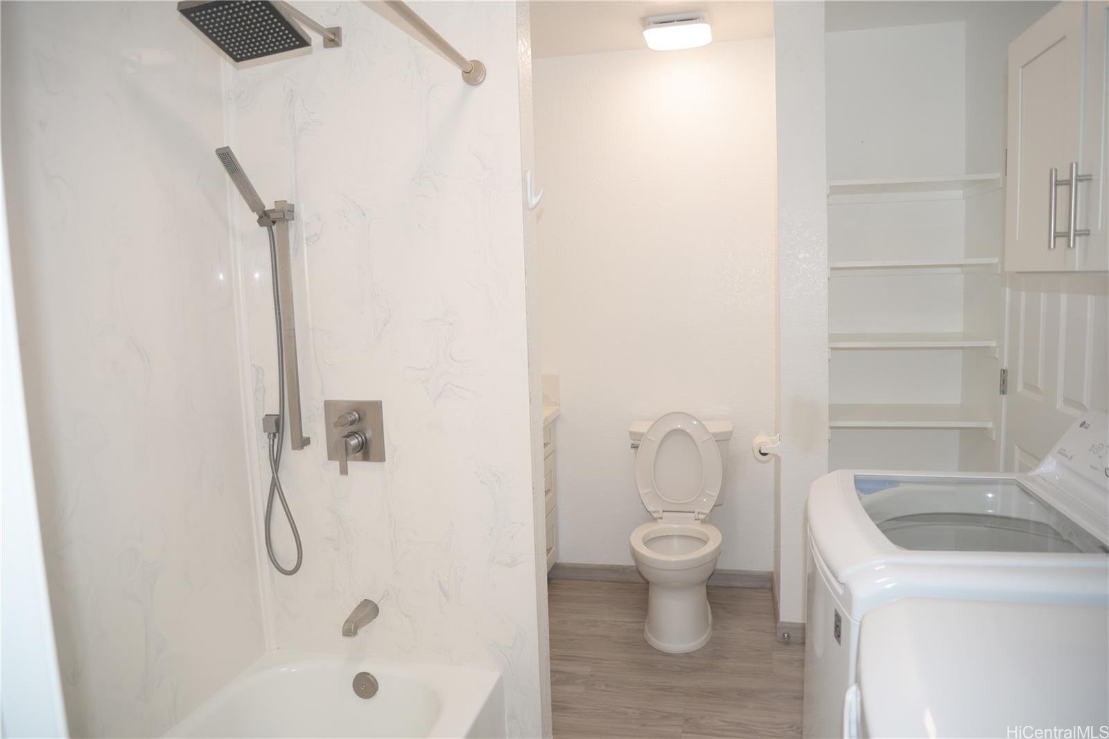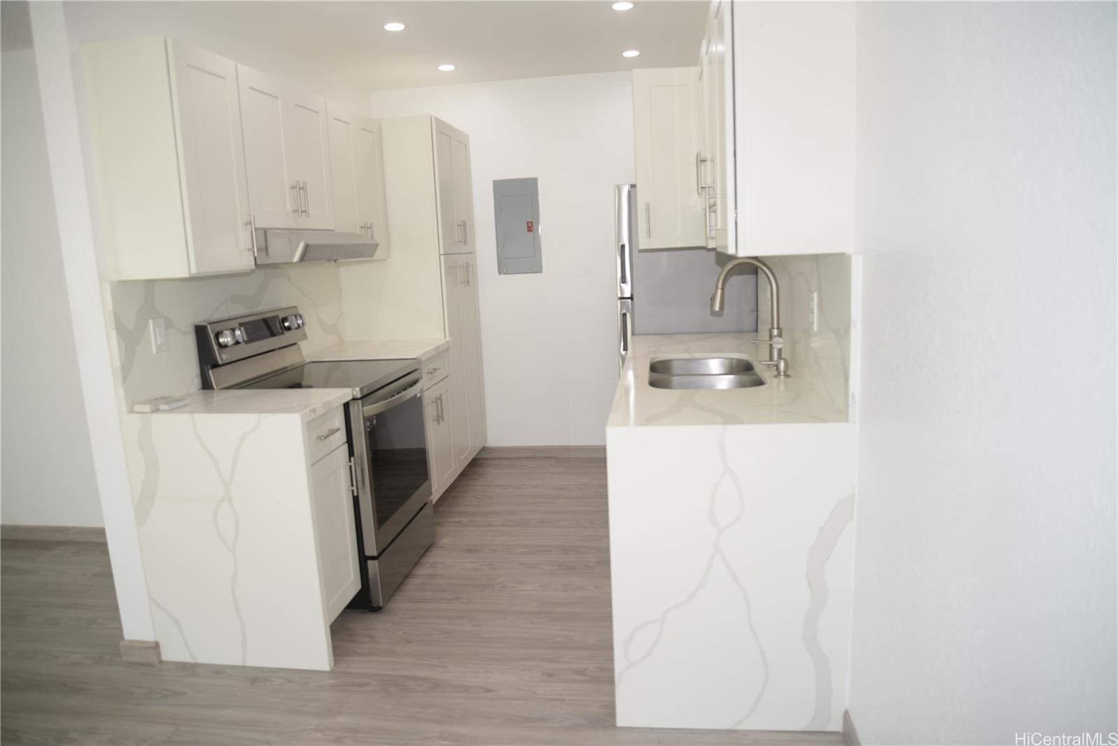 No Upstairs unit, rarely listing single level apartment upgraded in 2024 with new windows, new split air conditioning, new cabinets and counter tops, new electrical fixtures, and much more. Even the bathroom was totally redone in 2024. Flooring was installed in 2023. Apartment is positioned to catch the trade winds. The enclosed patio has a large concrete slab added to the small, covered lanai.