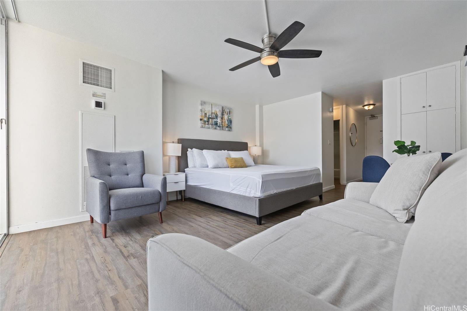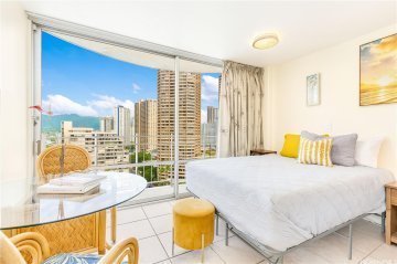 Experience the perfect blend of style and investment potential at the iconic Ilikai Marina. This stunning studio has been completely reimagined with newly renovated turnkey finishes and high-end furniture, specifically designed to maximize the guest experience. Located in the coveted Resort Zone, this property allows for legal short-term rentals, making it a high-value opportunity for savvy investors or those seeking a stylish Honolulu pied-à-terre.In this thoughtful redesign studio features a fully equipped kitchen with custom cabinetry, a dedicated dining area, and a separate study desk for the modern traveler. The versatile sleeping arrangements include a plush king-size bed and a comfortable sofa bed, ensuring maximum occupancy and comfort. Large windows frame a beautiful mountain view, offering a serene backdrop to the vibrant Waikiki lifestyle.Perfectly positioned for convenience, you are within easy walking distance to the world-class Ala Moana Center, the yacht harbor and the boat park. On-site paid parking is available, and the unit comes fully equipped for immediate Airbnb use. Well-priced and offering incredible value, this is Waikiki living at its finest!