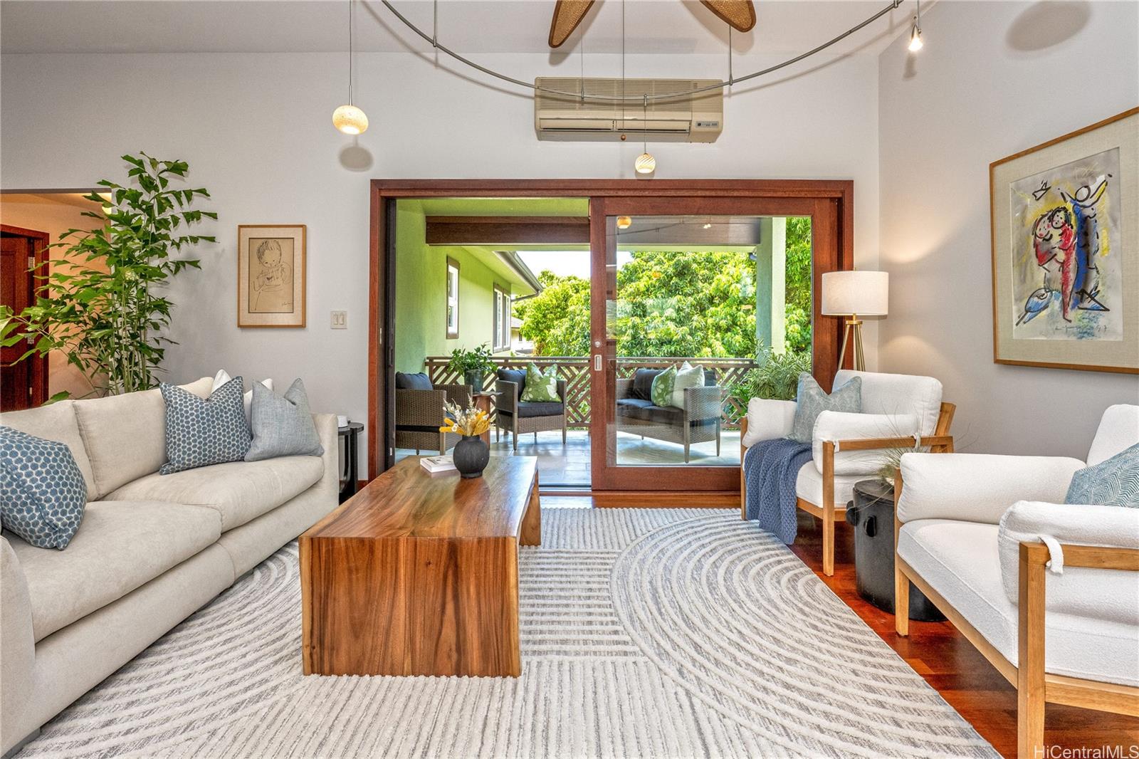 Discover tranquility and luxury in this unique Bali-inspired 3-bedroom, 2-bathroom townhome, nestled in the heart of Manoa Valley. This exquisite property is part of an unique 4-unit CPR townhome complex, offering a private pool and driveway for convenience. Enjoy the elegance of solid tongue and groove Merbau wood floors complemented by custom Merbau millwork throughout the home. Bathrooms feature stone floors and green marble, kitchen features a gas range, wine fridge and surrounding windows offering ample lighting. Unwind on your private lanai off the living room or on the large deck with breathtaking mountain views. The property is tucked in a private tropical oasis overlooking the serene Manoa Stream, yet minutes to Manoa Valley Marketplace, Manoa District Park, Noelani Elementary School, and the University of Hawaii. This townhome combines the serene ambiance of a zen oasis with the convenience of urban living. Don't miss the opportunity to own a piece of paradise in the heart of Manoa Valley.