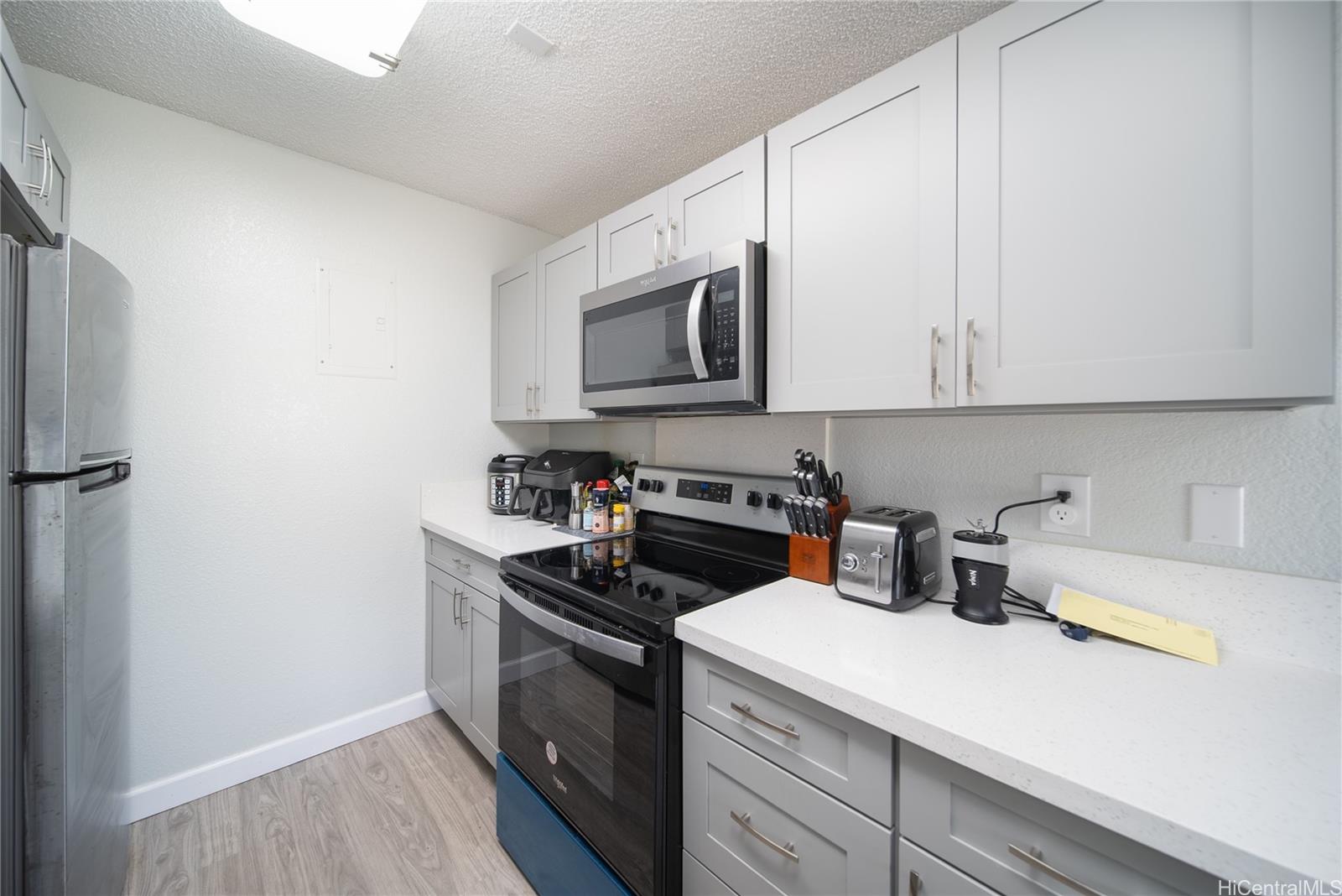Experience modern island living in this beautifully renovated 2-bedroom, 1-bath townhome in the heart of Waipio. Thoughtfully updated with fresh paint and luxury vinyl flooring, this home feels bright and inviting from the moment you walk in. The kitchen features brand-new cabinets, quartz countertops, and stainless steel appliances, perfect for home-cooked meals and entertaining. Enjoy two well-sized bedrooms, a refreshed bathroom, and the convenience of your own parking space plus ample guest parking nearby. With Waipio and Waikele Shopping Centers, Costco, the freeway, and Kamehameha Highway all within minutes, this move-in ready home offers the perfect blend of comfort and convenience.