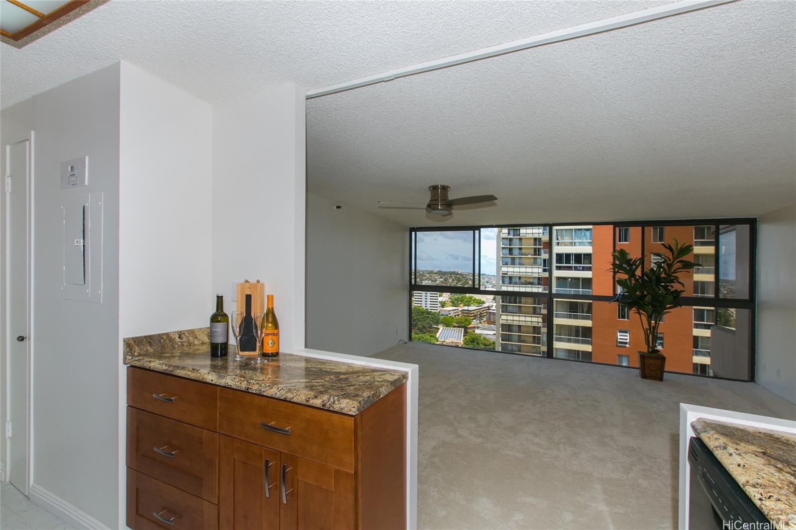 Super views of mountains, UH, Diamond Head to Waikiki! Newly renovated kitchen, flooring, fan and freshly painted. Cool island breezes flow in this corner end unit w/one semi-covered parking in secured garage and building. Plus Fire Sprinkler System and intercom/fire alarm. Electricity billed monthly from Management Company. OPEN HOUSE: SUNDAY JANUARY 6, 2019, 2-5 PM