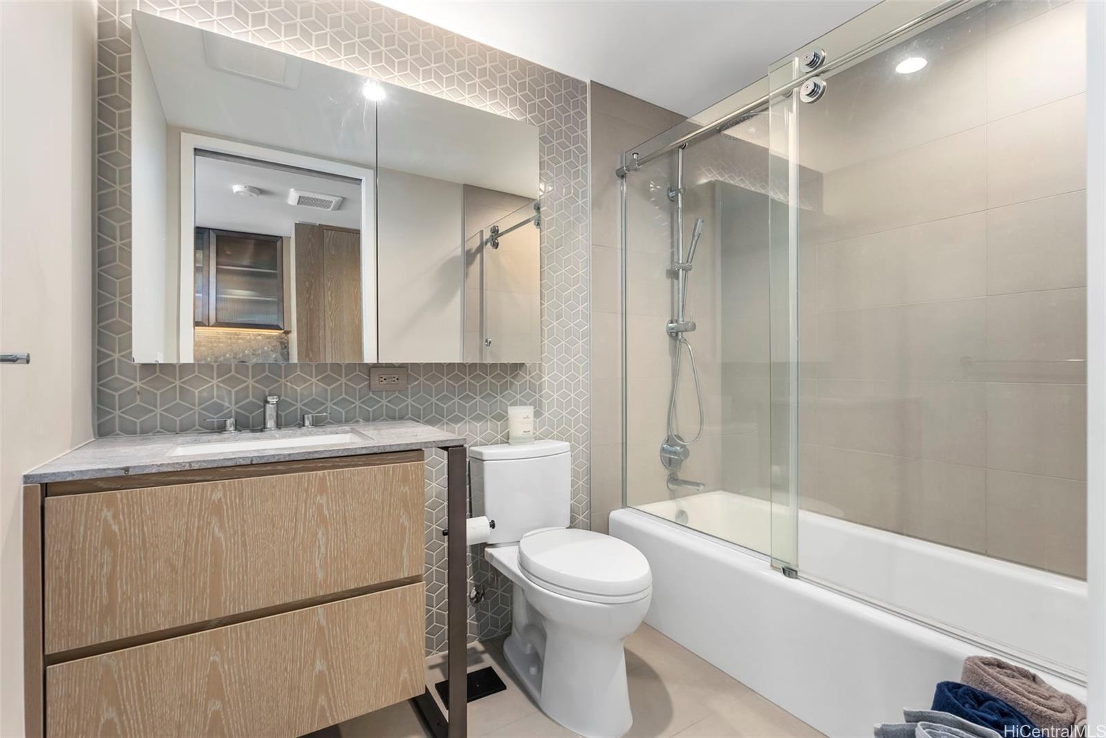 Experience luxury and convenience with this modern studio unit at Ko’ula featuring natural stone countertops, Miele appliances, custom cabinetry, beautiful hardwood floors, 9 foot+ ceilings, floor to ceiling windows, a Juliet balcony, and Miele washer & dryer in unit! Located on the cooler side of the building with natural light, custom pull down blinds, and a convenient full sized parking stall located on the same floor as unit (no elevators needed to get to unit)! Ko’ula’s resort style amenities include an expansive lap pool, 2 jacuzzis, sauna rooms, bbq pavilions, indoor/outdoor entertainment rooms with full kitchens, indoor/outdoor fitness areas, multiple guest suites for visiting family and friends, grand lanai with lounge seating and billiards table, playground, 24-hr security and more! Building is VA approved and is FULLY insured! The Ward Village ecosystem provides ultimate convenience including Ward Theater, Victoria Ward Park, Kaka'ako farmers market, award winning restaurants, bars, shops, and close to the beach. 1 photo has been virtually staged(enhanced).