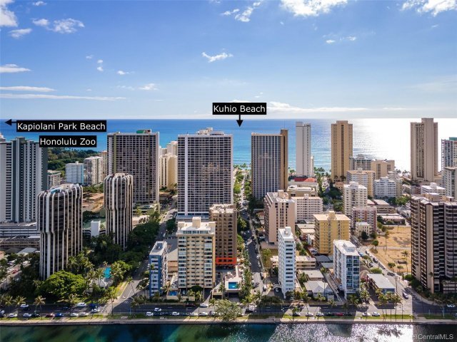 What an amazing value, a 2BR/2BA in Waikiki with a owner’s suite, washer & dryer and partially covered assigned parking! Come home and relax in your own slice of Paradise. With a lanai off of EVERY bedroom and your living room you can decompress looking over the Ala Wai Canal and mountains. Walk and bike to the parks, Zoo, famous beaches, restaurants and more. Not to mention amply street parking. This renovated condo has new rich colored cabinets and counters, flooring, is freshly painted and has floor to ceiling tile in both bathrooms. All you have to do is move in! HOA dues include everything: Central AC, electricity, cable, maintenance, pool, security and more. VA & FHA approved. Look for the virtual tour link*