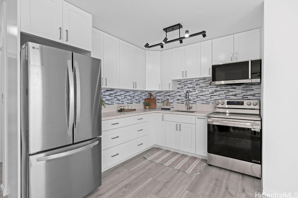 Welcome to Leolua Regent with a beautifully renovated 2 bedroom, 1 bath residence with 1 assigned parking stall. This unit is completely move-in ready and was fully renovated in 2026, thoughtfully updated with modern finishes throughout.Upgrades include brand new vinyl plank flooring, fresh interior paint, new kitchen and bathroom cabinets, updated countertops, new stand up shower, and all new appliances; creating a clean, contemporary feel that is truly turnkey and ready for its next owner. The efficient layout is designed to maximize space and functionality, and the interior feels larger than its square footage suggests.Abundant natural light fills the home with refreshing cross-breezes that flow through the unit, enhancing everyday comfort. One assigned parking stall is included and additional street parking.Conveniently located with easy access to major freeway connections, shopping centers, dining, and a variety of everyday amenities. Whether you are looking for a primary residence or investment opportunity this updated unit offers both comfort and accessibility.