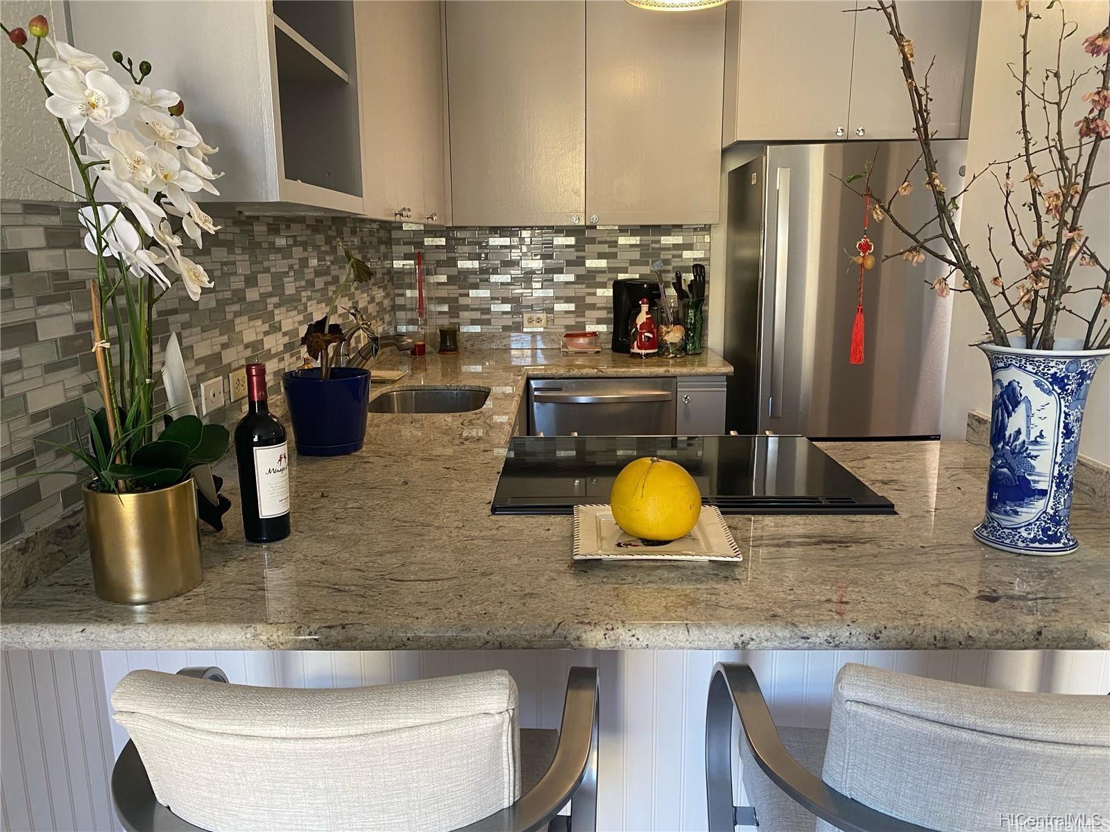 Masterfully and Newly renovated, highly desired King Tower unit, more relaxed side of the structure with Ala Wai Canal and fabulous golf course views. The owner made an excellent renovation for her to retire/stay by removing the popcorn ceiling, painting, new flooring, etc.! Partly furnished turn-key unit with new refrigerator, stove, dishwasher, extensive use of granite in kitchen, beautiful drapes, and renovated bathroom! Beautiful exotic grounds with the Queen’s Garden, including a beautiful koi pond, large pool, Jacuzzi, recreation area, and tennis courts. 24-hour security with a secure parking (leased $280/yr parking) and guest parking. Sprinklered building.