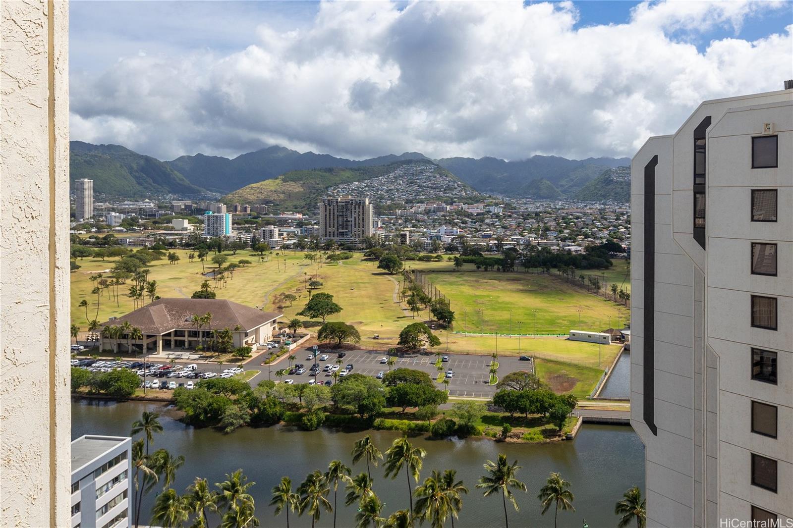 Liliuokalani Gardens' King and Queen towers surrounded by beautiful gardens and serene atmosphere are located in the heart of Waikiki. Great views of Ala Wai Canal, golf course, mountains and Diamond Head. This unit is in Queen Tower, closer to the parking structure. Tastefully renovated and nicely furnished. Bright with lots of light will make your spirits high. Washer/dryer in the unit. Cool side of the building.