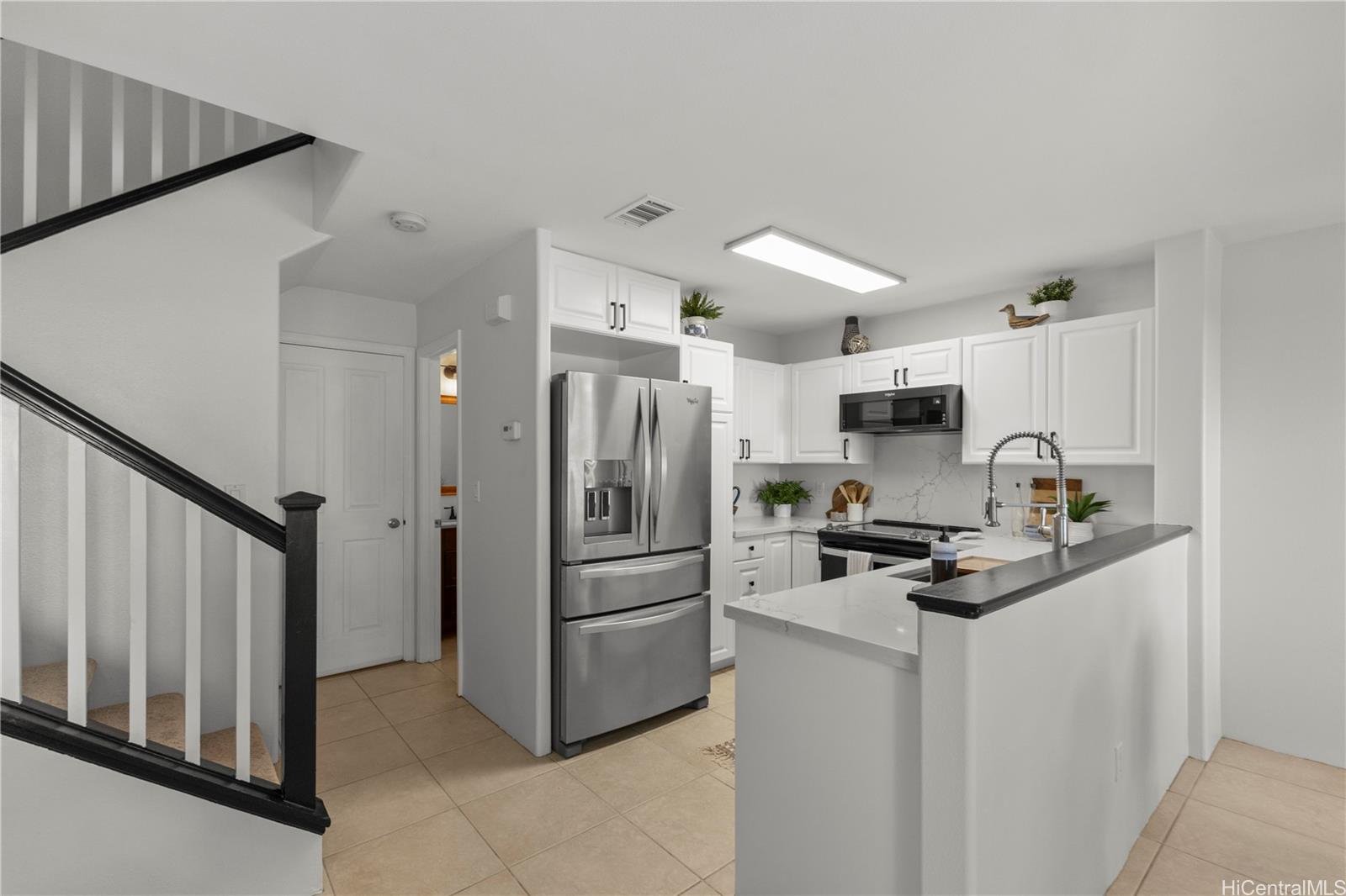Welcome home to this bright and updated 3-bed, 2.5-bath townhome in the popular Mariners Place. From the moment you walk in, you’ll feel how open and welcoming the space is—your kitchen, dining area, and living room all flow together, making it easy to cook, relax, and spend time with loved ones. Half-bath conveniently located on the main floor - perfect for entertaining.The upgraded kitchen includes stainless steel appliances and beautiful quartz countertops and backsplash. The first floor features easy-to-maintain tile, while the upstairs bedrooms offer cozy carpet and a walk-in closet in the primary bedroom. With no neighbors above or below and your own attached 2-car garage, the home truly feels like a private retreat. You’ll also love the fenced-in yard, perfect for pets, morning coffee, or a little outdoor downtime.Central AC keeps the home cool and comfortable year-round. Full size washer-dryer in the garage. Mariners Place is known for its quiet streets, pocket parks, and friendly feel—plus you’re just a short distance from restaurants, shopping, and everyday conveniences.This is a wonderful opportunity to settle into one of Ewa Beach’s favorite neighborhoods.