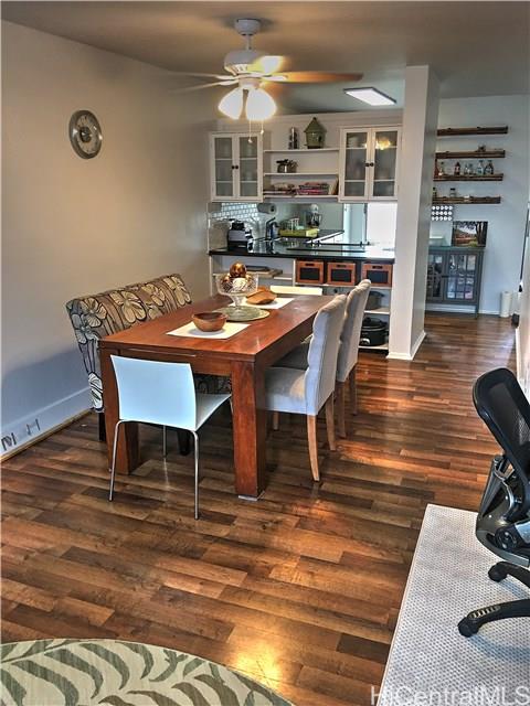 ((( Rare 2 Parking! ))) New Paint throughout this split level 2 bedroom/ 1.5 bath spacious townhouse. Lot's of upgrades include built in cabinetry in the dining area of kitchen counter top. Kitchen cabinetry has custom chrome wire baskets pull out organizers in pantry. Bathroom floors installed with water proof material featuring a "beach wood plank" style. Lot's of potential for you to make it your own! Second floor unit offers some privacy and security! A new on site manager will help coordinate Nani Koolau future improvements! Bring in your offer.....Seller is Motivated!