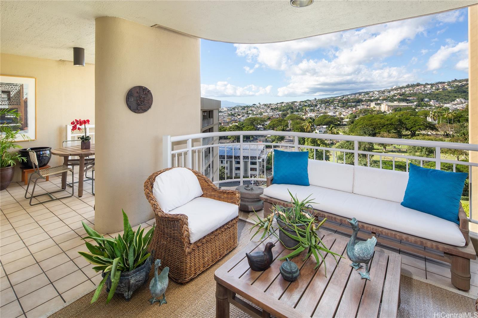 Rarely available "04" corner unit with TWO amazing huge covered lanais! Enjoy indoor/outdoor living on the Cooler side of this secured boutique building. CORNER unit provides lots of windows to the DRAMATIC Mountain Vistas and plenty of space for outside dining and an extra outdoor living room! Perfect for entertaining or relaxing at home. S-P-A-C-I-O-U-S Living Room and wonderful floor plan! The Kitchen offers a VIEW & Pass Thru to the lanai dining area. Granite Countertops, newer stackable front-loading washer and dryer, pretty bathrooms, Central AC, and 2 parking stalls are a big plus. Amenities include PRIVATE Temperature Controlled WINE Storage, a heated Pool, Storage Locker, Business Center, Gym, Party/Meeting Room and lovely BBQ area. PERFECT Location near Downtown, Hospitals & Freeway. A rare unit for the discriminating buyer.