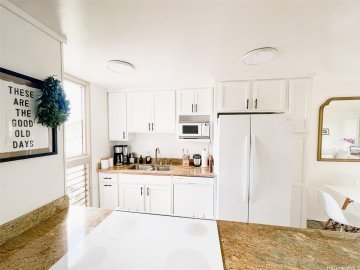 Beautiful mountain and OCEAN views welcome you home to this finely appointed, completely remodeled split level top floor Ono Vista unit.Walk in onto hand-scraped bamboo hardwood floors, dine on a monkeypod table along with a custom monkeypod backsplash and countertop in a brand new kitchen with all new appliances.Redwood walls and accents that lead you to cedar-lined headboard walls in the bedrooms.Behind a new bathroom barn door with privacy glass, open up to an oversized sparkling new bathroom w/marble walk-in rain shower & river rock tiling as well as custom teak dual-vanity sink.You must see it for yourself!
