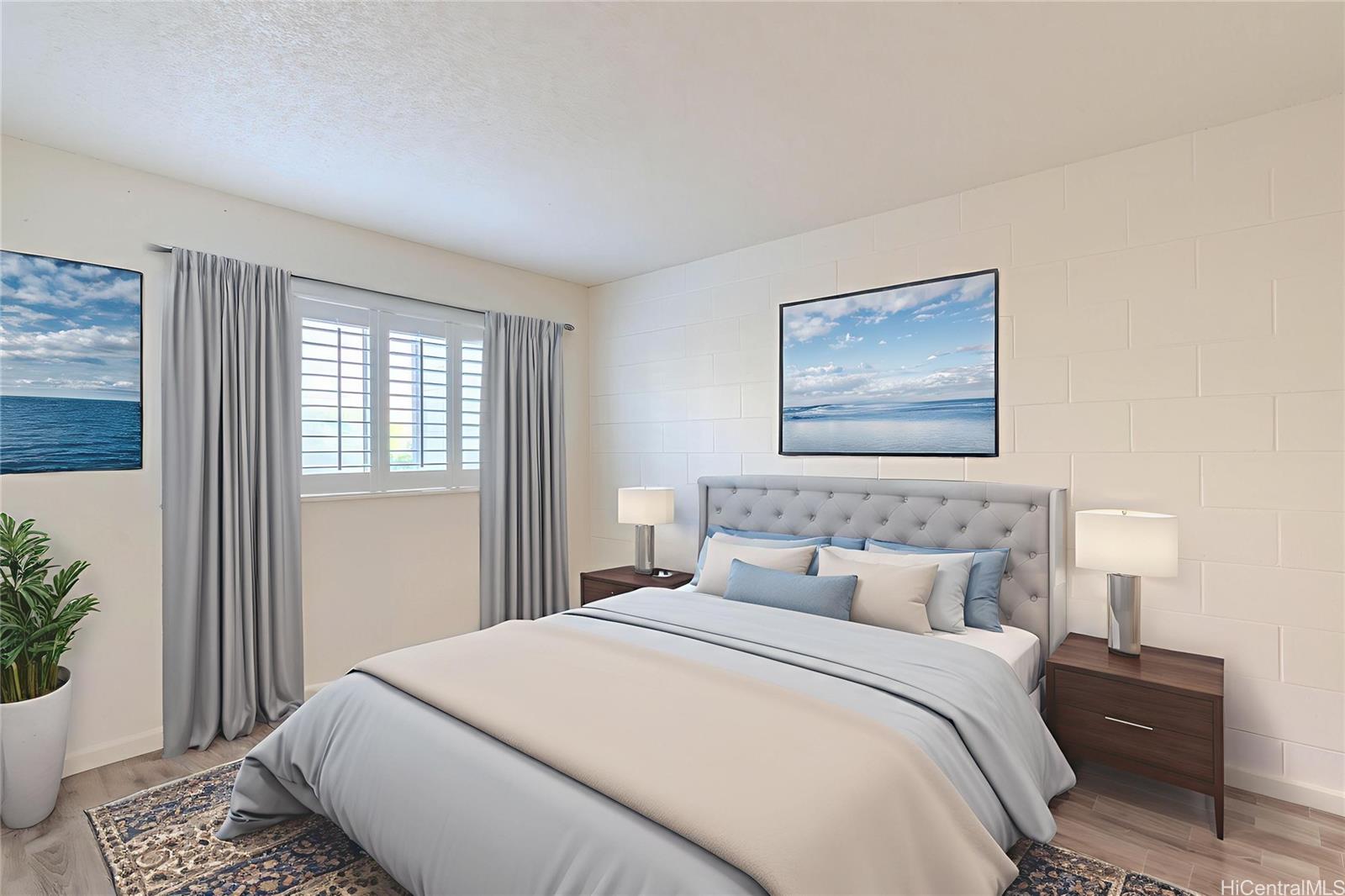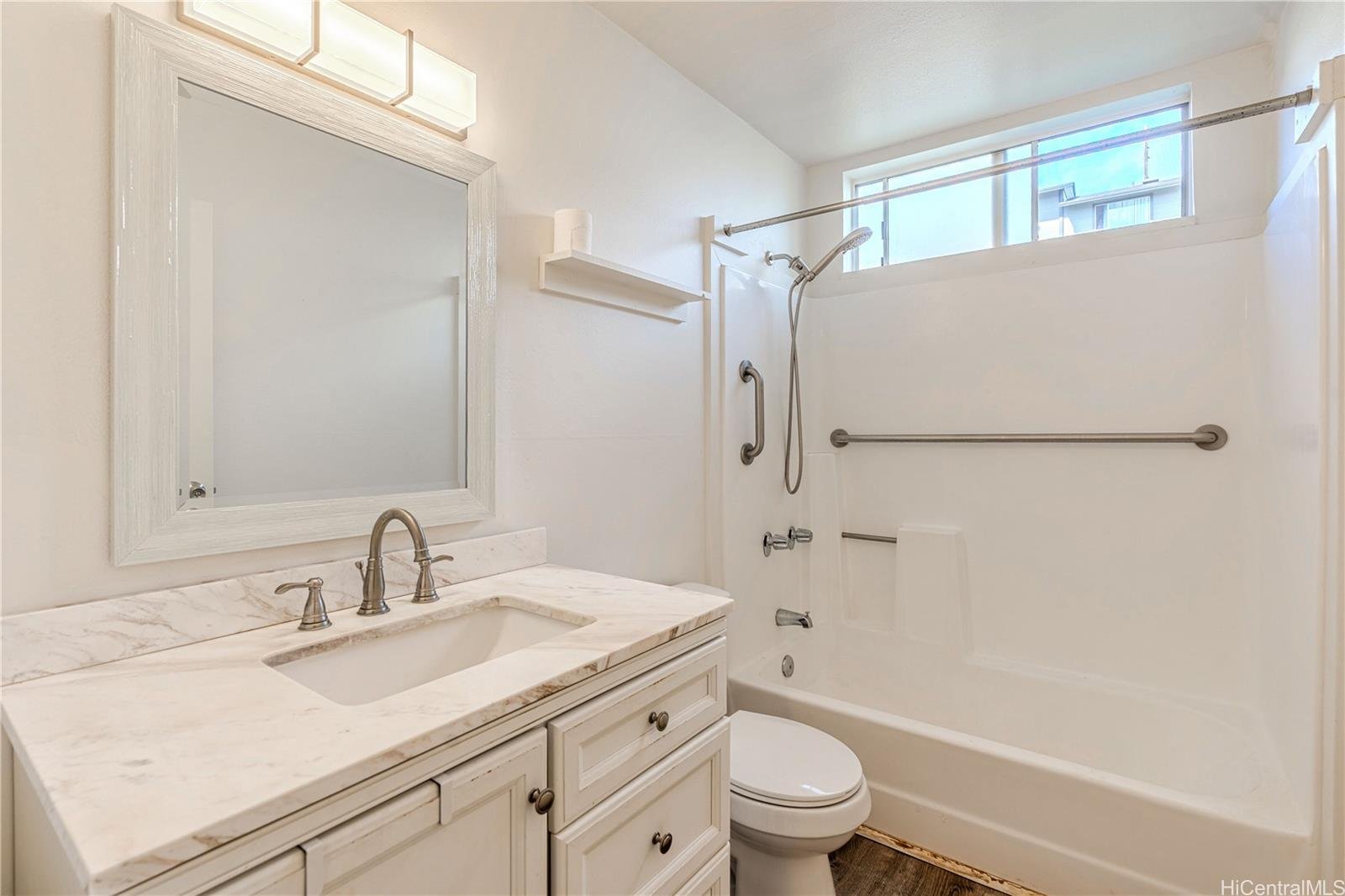 Step into effortless island living with this beautifully remodeled, move-in-ready 2-bedroom ground-floor unit that blends modern style, everyday convenience, and undeniable value—VA approved and complete with a designated parking stall. From the moment you enter, you’ll notice the upscale finishes: brand-new plantation shutters on every window, sleek grey luxury vinyl flooring throughout, and crisp white shaker cabinets with soft-close drawers that elevate the entire space. The stunning kitchen steals the show with quartz countertops, a striking Tiffany Blue backsplash, stainless-steel appliances, and an upgraded laundry center, all designed for both function and flair. Fresh interior paint, contemporary lighting, and a modern bathroom vanity deliver a clean, polished feel, while generous closet and pantry storage keeps everything perfectly organized. Enjoy a partial mountain view and unbeatable proximity to Kapolei, bus lines, shopping, dining, parks, schools, and quick freeway access—this is the rare turnkey opportunity buyers wait for but rarely find. Must see to appreciate