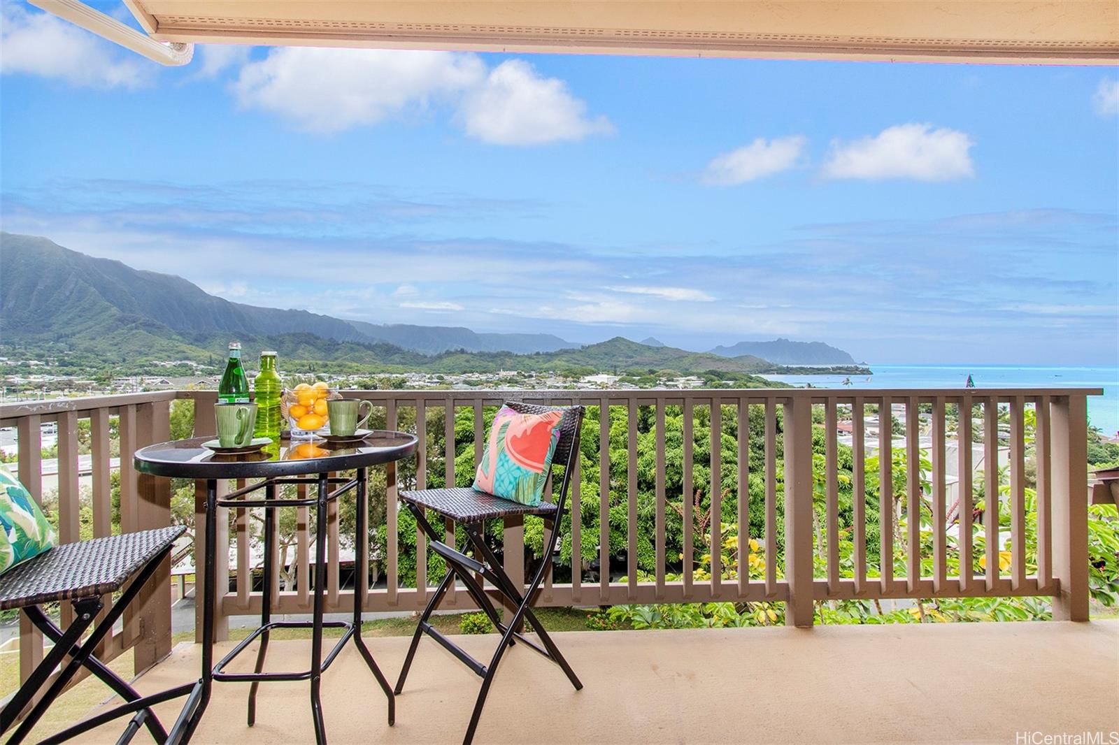 Breathtaking panoramic views from the Ko’olau range to the BLUE OCEAN of Kaneohe Bay & Chinaman's Hat. Have breakfast or dinner on the open lanai as you take in the gorgeous OCEAN views. Large 3bd, 2 ba, w/ 2 cvd pking features a spacious open floor plan, vaulted ceilings, great cross ventilation, bdrm & full bath on first floor, & an exclusive, private entry to your unit. Live the Hawaii lifestyle with resort like amenities in a park like setting: club house, pools, tennis courts, guest pking, walking paths. Quiet yet conveniently located - walking distance to Windward Mall, Farmers Markets, Restaurants, Supermarkets. Easy access to H-3, Likelike, Pali, Marine Corps Base Hawaii. **Bonus! “Association approved” exclusive storage closet at the front entry”.