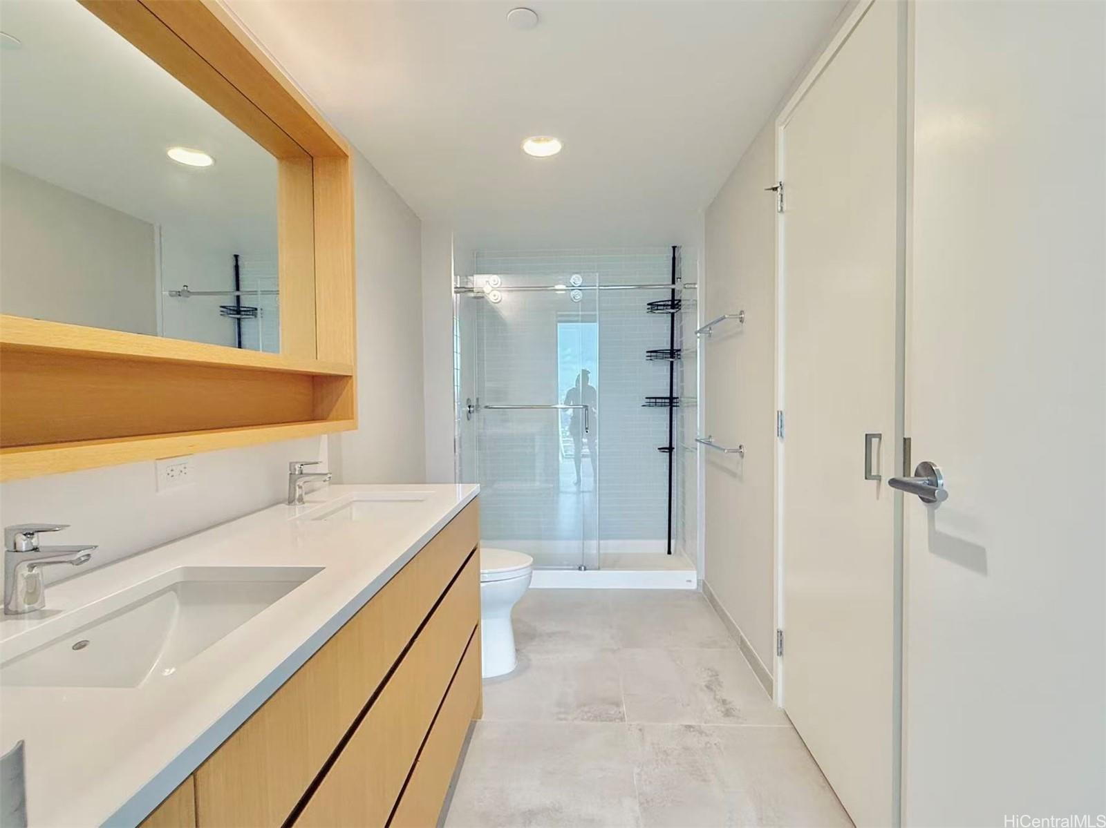 Welcome to Sky Ala Moana West #2106 — the highly sought-after #06 stack, known as the best layout in the building. This unique floor plan features a true dining area rarely found in other units and two spacious bedrooms, each with its own walk-in closet. The 2-bedroom, 2-bath residence offers 809 sq ft of interior living space plus a 99 sq ft lanai with beautiful city, mountain, and partial ocean views. Completed in 2023 and kept in great condition, it features a modern kitchen with quartz countertops and Bosch appliances, including a refrigerator with ice and water dispenser, split A/C in every room, in-unit washer/dryer, and curtains included. Enjoy wonderful resort-style amenities with two pools, spa, fitness center, BBQ cabanas, multiple party and recreation rooms, and 24-hour security. Ample guest parking with EV charging stations for visitors. Excellent Ala Moana location—across from Ala Moana Center and close to beaches, dining, and entertainment. Move-in ready. Great night view of Honolulu’s city lights—see photos! This can be your perfect home.