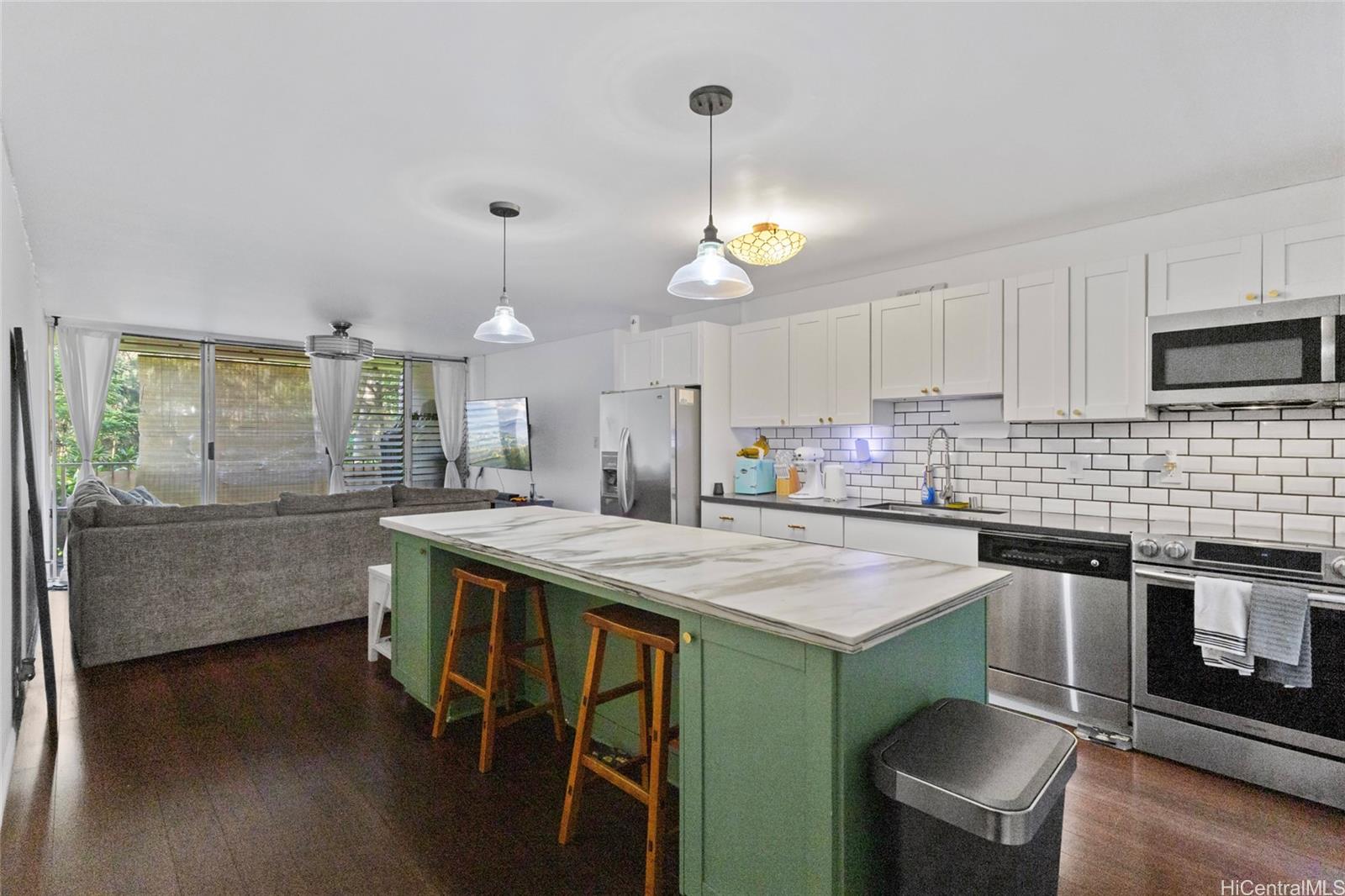 Welcome home to Waikalani Woodlands! If a short commute is important to you... this is the place for you. Literally minutes from Schofield Barracks, this 2 bed, 1 bath, beautifully renovated condo with 2 parking feels like home. This second floor unit offers a spacious layout with a large kitchen island, brand new microwave, tons of storage, and a wonderful modern feel. From the kitchen, step right into the spacious living space with endless layout opportunities. From here, you look right out onto your lanai, where you have the privacy of no units outside, just a peaceful, forest backdrop. The primary bedroom features a large closet with a sliding barn door and the 2nd bedroom is perfect for an office space or hosting guests. The bathroom has been beautifully updated with new tiling in the shower. This home also features a brand new washer and dryer set, which is thoughtfully placed just outside the bedrooms for ease of access. This home is perfectly located in Northern Mililani, just a short drive from all of your shopping and dining needs. Don’t wait, schedule a tour now!